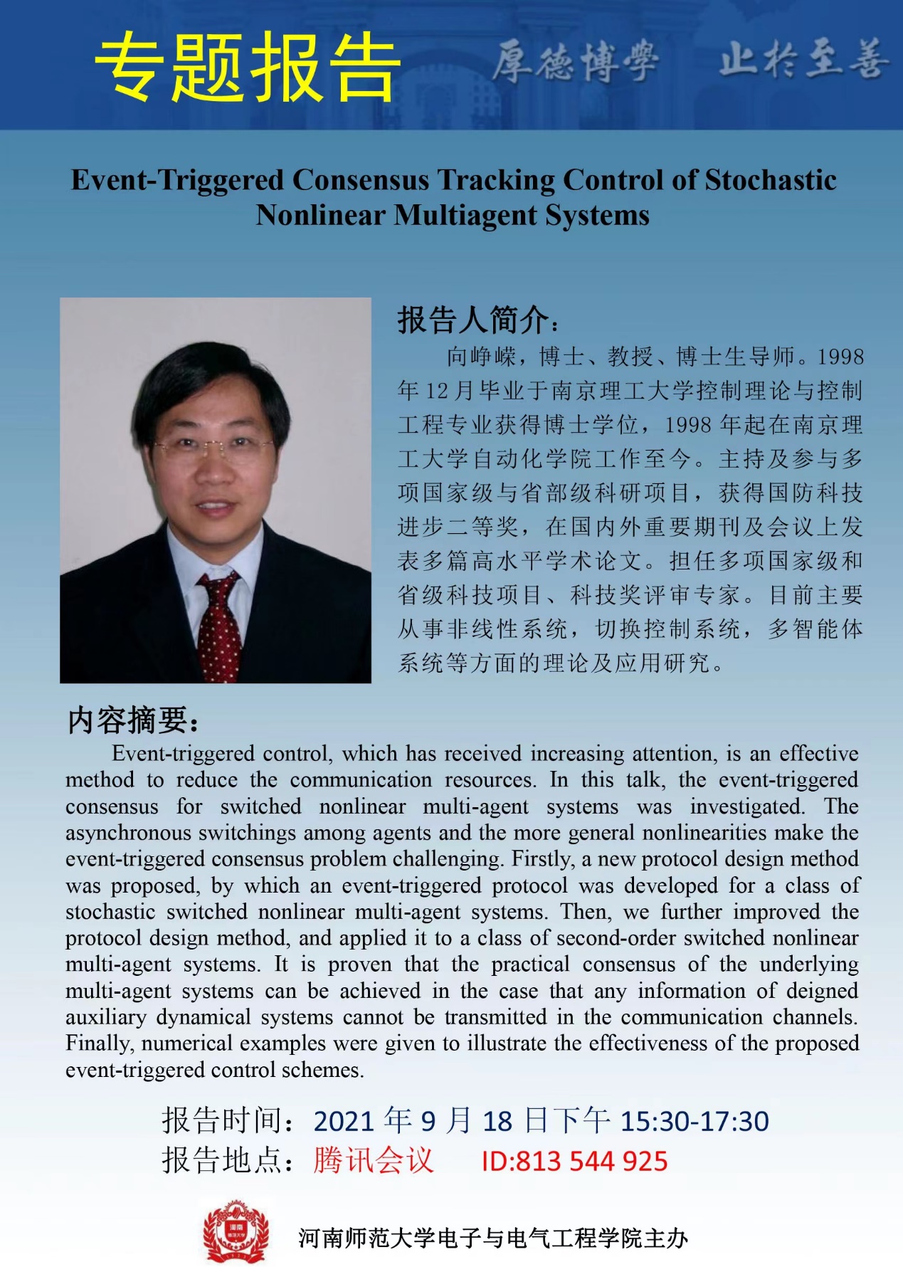 通讯地址:河南省新乡市建设东路46号河南师范大学电子与电气工程学院