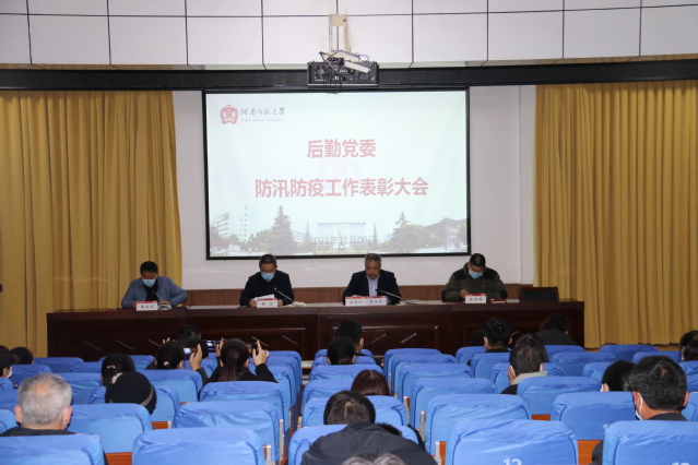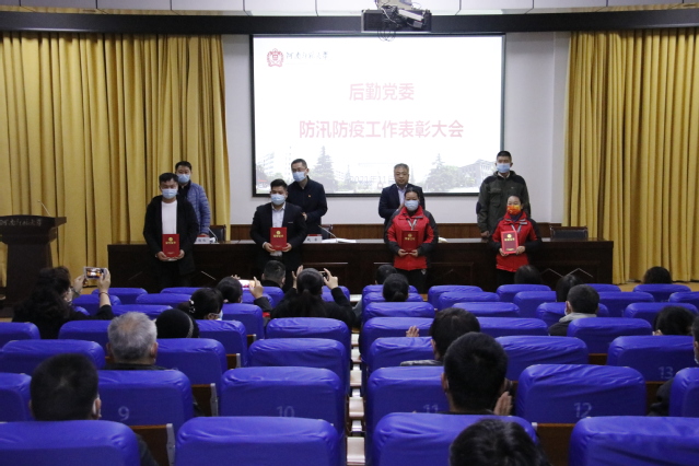 后勤党委书记赵岩讲话,指出本次表彰大会旨在认真总结后勤在防汛救灾和防疫工作取得的成果和经验,表彰为防汛、防疫做出突出贡献的先进个人,焕发开拓进取、干事创业的高昂斗志,凝聚知重负重、攻坚克难的磅礴力量,为今后继续做好学校后勤服务保障工作而不懈奋斗。在防汛工作中,后勤抢险队员不顾安慰、一线出征,全力打好师生生命财产安全保卫战;后勤各部门扛牢责任、各司其职,全力做好本职工作保障校园安全;后勤全体职工和员工发扬了能吃苦、能战斗、能拼搏的优良传统,全力保障校园师生正常生活。防汛工作充分展示后勤党员干部职工和合作企业员工的责任担当,发挥了先进典型的示范引领作用。