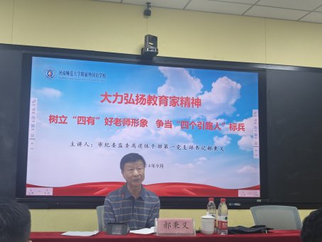 9 月 24 日下午,河南师范大学附属外国语学校特邀市纪委监委离退休干部第一党支部书记郝秉义莅临我校,讲授“弘扬教育家精神”专题党课。新乡市教育局党组成员、副局长苏绍彬和我校党支部书记、校长罗强陪同。