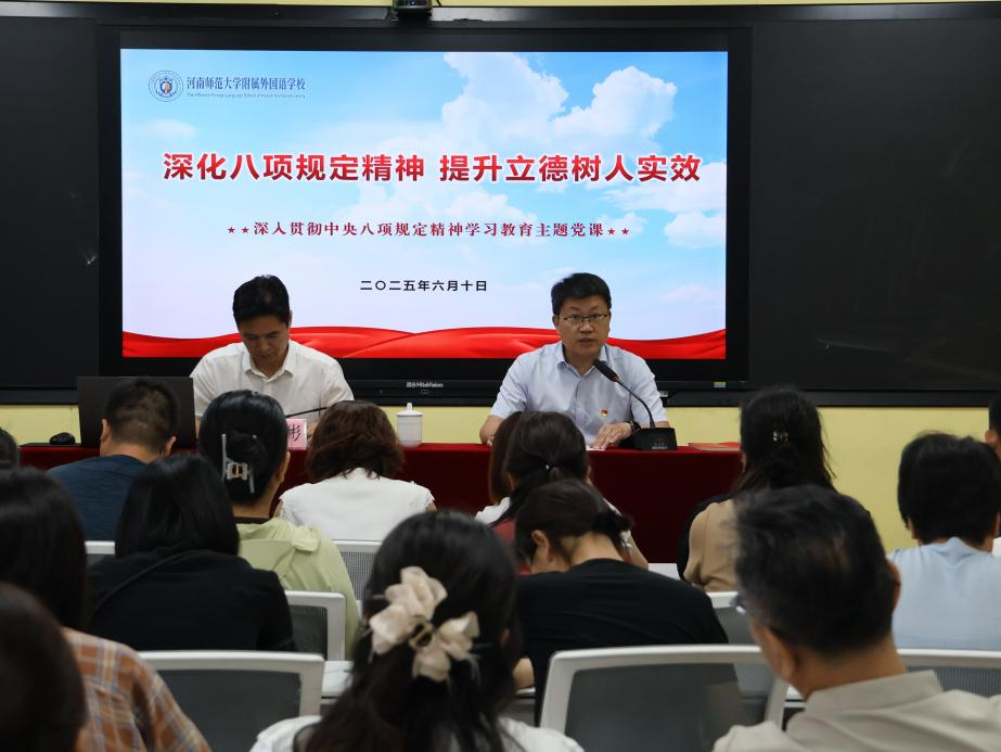 为深入贯彻落实中央八项规定精神,进一步加强党风廉政建设,提高教师队伍的政治素质和职业道德水平,2025年6月10日下午,河南师范大学附属外国语学校邀请市教育局党组成员、副局长苏绍彬同志为全体党员干部讲授“贯彻落实中央八项规定精神学习教育”专题党课。此次活动不仅是一次深刻的党性教育, 更是催人奋进的行动号角,让清廉之风吹拂育人沃土。