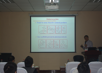 施敏作了题为“基于铑、金、铂卡宾的化学转化”的学术报告。报告详尽介绍了其课题组通过铑卡宾、金卡宾和铂卡宾合成多元并环化合物的策略,即通过巧妙的底物设计,实现了一步构建多元杂环、桥环类化合物,并对反应机理进行了详尽的阐述。同时,利用分子内的环丙烷联烯片段,实现了Rh/Ag金属的共催化反应,一步完成了具有手性的六元杂环化合物的构筑。报告会结束后,与会师生就报告的内容提出了一系列问题,施敏研究员一一进行了解答。