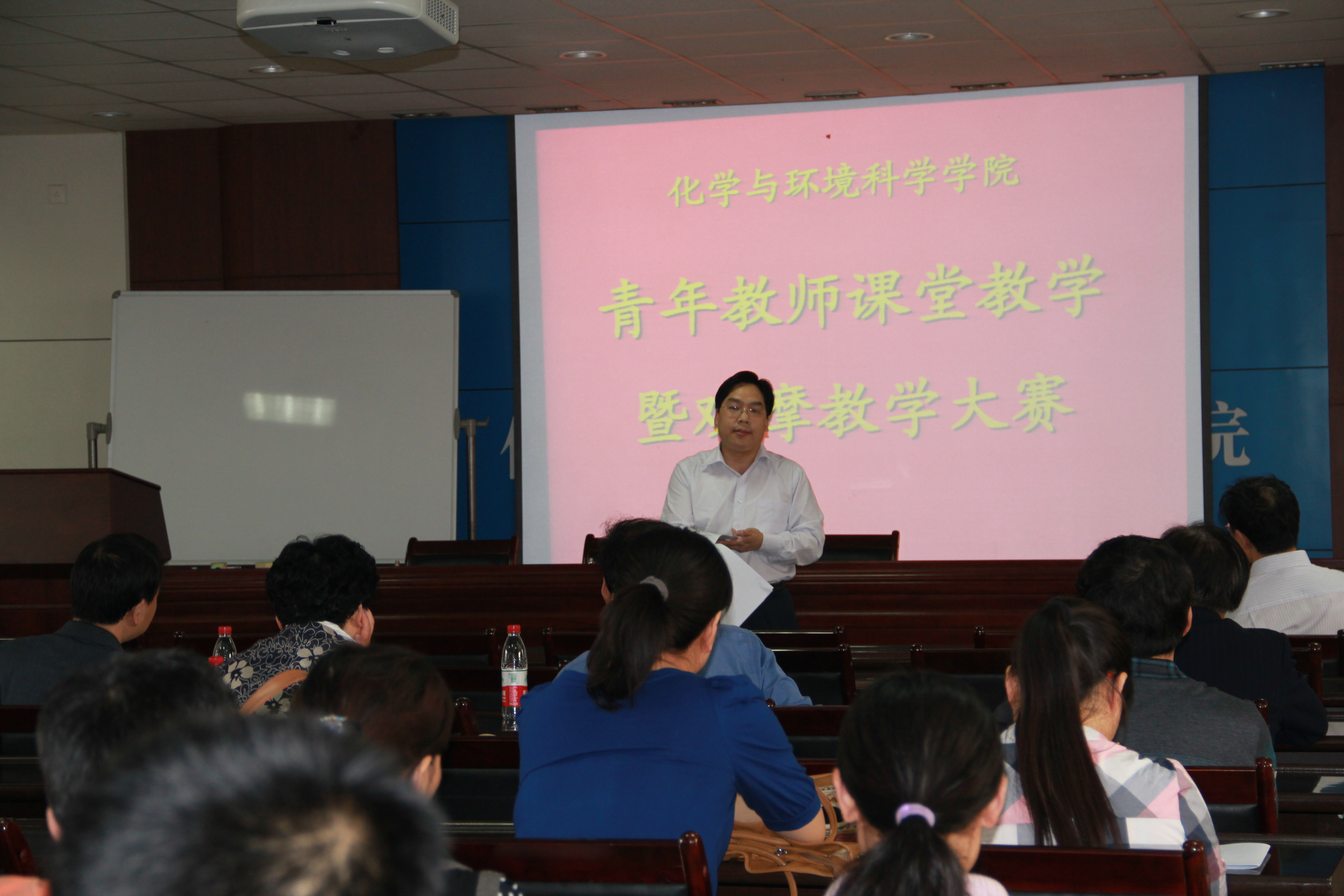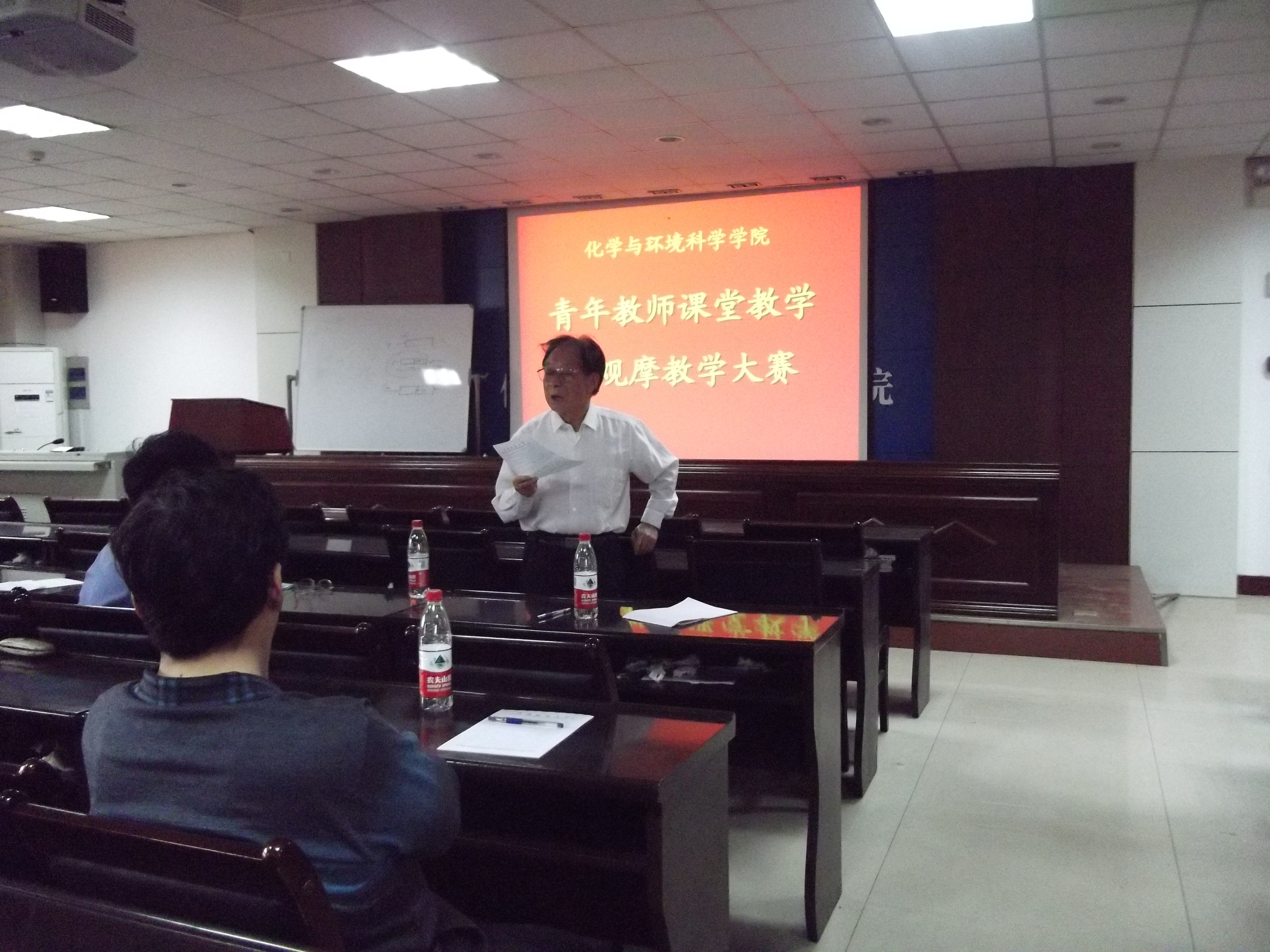 5月7日上午8:00,学院青年教师课堂教学暨观摩教学大赛在化学北楼五楼会议室,开幕式有郭海明副院长主持,大赛有国家教学名师渠桂荣教授担任评委会组长,校督导组张庆芝教授、院督导组牛新书教授,冯素玲教授、胡志国教授、娄向东教授以及环保教研室的孙建辉教授担任本次比赛评委。各教研室共推荐12名选手参加本次比赛,学院40岁以下的青年教师观摩了本次比赛。