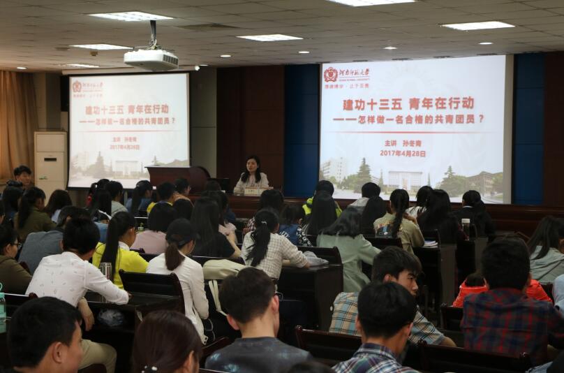 孙冬青以“做一名合格的共青团员”为题,从“什么是共青团,共青团能为青年做什么,共青团应如何改革和发展”三个问题为切入点,为同学们上了一堂精彩的团课。在团课中,孙冬青就中国共青团的发展史、基本任务、组织要求及改革方向等方面进行了详尽阐述,并从坚定理想信念、练就过硬本领、勇于创新创造、矢志艰苦奋斗、锤炼高尚品格等五个层面和生动形象的事例强调了做一名合格共青团员的重要意义,引发广大团员积极思考和思想共鸣。最后她勉励同学们,要坚定实现伟大复兴中国梦的信心,勇于承担起中国未来的重担,为实现中国梦作出积极贡献。