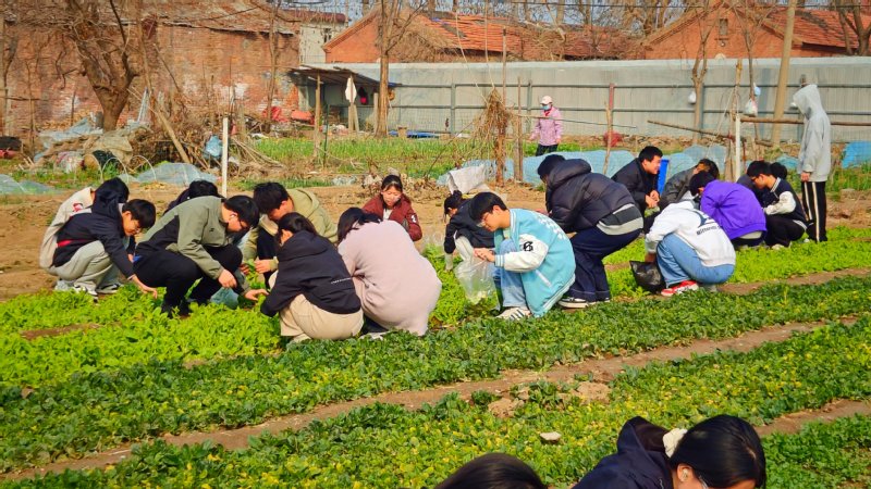 活动开始前,张振楠进行示范操作并强调:开展劳动教育目的在于希望大家通过实践劳动树立劳动创造价值的认知,培养大家养成基本的生活技能,提升动手操作能力和问题解决能力。随后,在春意盎然的勤耕园里,同学们有序分工,划分区域,认真学习如何辨别菜苗是否成熟同时掌握了采摘的技巧。从弯腰采摘到清理根茎,从摘除黄叶到分拣打包,看似简单的农作流程暗藏劳动智慧。随着菜篮逐渐被青翠的蔬菜填满,同学们真切体会到“一粥一饭当思来之不易”的深刻内涵。活动尾声,同学们手捧劳动成果一同分享快乐,绽放的笑容里映照着对劳动价值的全新认知。