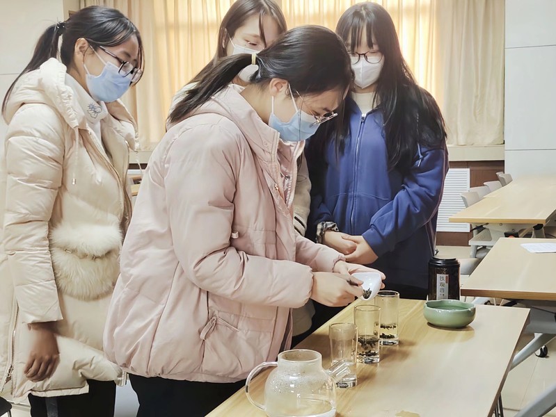为弘扬中华优秀传统文化,引领更多学生感受茶文化之意蕴。11月27日,我院茗韵茶艺社于化学北楼五楼会议室成功举办以”烘烤煎焙,茶香袭人”为主题的茶艺授课活动。本次活动采用线上线下相结合的形式进行。 活动伊始,主持人为大家介绍茶文化的历史,包括中国六大茶类、十大名茶的相关内容,同时还向社员们展示了茶盏、花神杯、茶漏,茶盘等茶具的照片。同学们全神贯注,认真听讲并做好笔记。随后,社员侯思佳作为本次茶艺课的主讲人为大家讲解茶具的演变、中国特色茶等相关知识,她还向社员们展示了茶艺,行云流水的茶艺动作使同学们沉浸于茶文化之美。茶艺表演结束后,社员们跃跃欲试,开始进行茶具的学习,在学习茶具的过程中,社员们积极踊跃地提出问题,社团工作人员为其进行答疑解惑,现场的学习氛围浓厚。最后,社团工作人员带领社员们进行评茶,同学们在亲自泡茶的过程中,一起走进茶艺的意境。至此,本次活动圆满结束。 “茶香悠悠,乐自逍遥。”此次活动的顺利举行,不仅丰富了同学们的校园文化生活,更使同学们领略到中国茶文化之美,提高了同学们的文化修养。 (法学院 杨丹 化学化工学院 李昕馨)