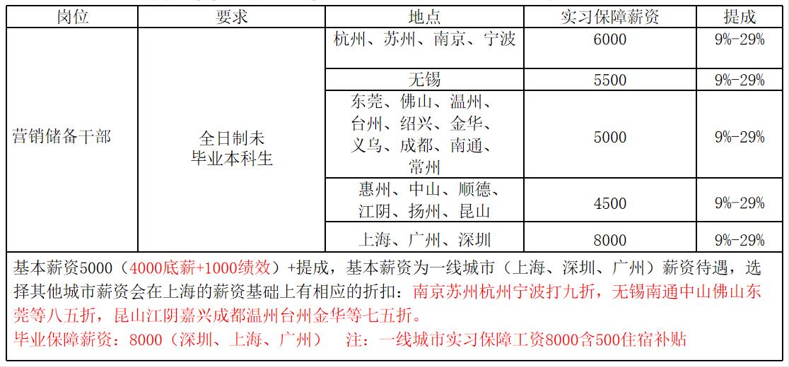 可选择城市:上海、深圳、广州、苏州、杭州、宁波、南京、无锡、常州、中山、佛山、东莞,昆山、江阴、嘉兴、温州、台州、金华、成都,选择城市不同薪资会有所不同。 四、公司福利 1、五险一金、员工宿舍(部分城市)、员工餐厅(总部)、带薪培训、带薪年假、年度旅游、定期团建、生日祝福、节日福利等。 2、公司提供1-3周的岗前线下带薪培训,入职后可加入珍岛太湖学园平台进行线上学习岗前培训包括——课程内容:企业文化、明星产品-T云、竞品优劣势分析、商务礼仪职业素养、员工发展路径解析等;——休闲娱乐:室内团队游戏、电影品鉴会、K歌、狼人杀、室外毅行活动 你的收获 1、薪酬:实习生平均基础工资6k-8k,平均高于同行业 40%; 2、福利:毕业即交五险一金(需有毕业证)、员工宿舍、员工餐厅、带薪培训、带薪年假、年度旅游、定期团建、生日祝福、节日福利等。; 3、培训:带薪岗前培训,职中培训、管理培训,终身免费培训; 4、晋升:所有中基层管理岗位内部提拔,公司处于预上市扩张期,晋升机会多; 6、人脉:企业级客户,从业期间积攒高质量资源人脉; 7、氛围:互联网公司,年轻化团队 open 愉悦的工作氛围; 8、生活:运动俱乐部(篮球,羽毛球,爬山,徒步),LOL, 5、应聘流程 【扫码添加微信/电话联系了解详情】-【投递简历】-【面试】-【发放offer】-【接受offer】-【岗前培训】-【入职】