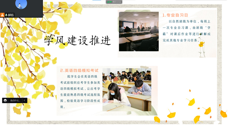 为了进一步加强学风建设,激发学生学习的积极性和主动性,4月15日,学院2020级化学三班团支部在腾讯会议上开展“建设学风,你我同行”主题班会,化学三班全体成员参加。 会议伊始,郭钰带领全体成员观看了五五四学风建设视频,学习河南省本科高校教学质量提升年专项活动具体内容,郭钰指出,该活动的目的在于提升课堂质量,并号召团支部成员积极投身学风建设中。随后,团支书安梦晓宣读河南师范大学学生会发布的《建设学风,你我同行——致全体在校生加强学风建设的倡议书》,她指出,班级优良学风是学生思想道德品质、学习精神与综合素质的重要体现,是学生成长的基础和前提,要积极响应学校号召,为学风建设贡献自己的力量。而后,全体成员学习学风建设和课堂教学质量提升重点措施,并表示要向优秀的学生学习,自觉遵守无手机课堂,建设优良学风。最后,郝慧琳介绍了班级学风建设的情况,对学习进步的小组团体提出表扬,并向大家提出注重课堂效率、课下交流学习经验、学生相互讨论疑难问题的建议。 会后,学生们纷纷表示对优良学风建设工作有了清晰的认识,不仅明确了学风建设的重要性,还提高了学习的积极性和主动性。 (化学化工学院 郭钰) 我院2020级化学工程与工艺班团支部开展“学风建设”主题班会