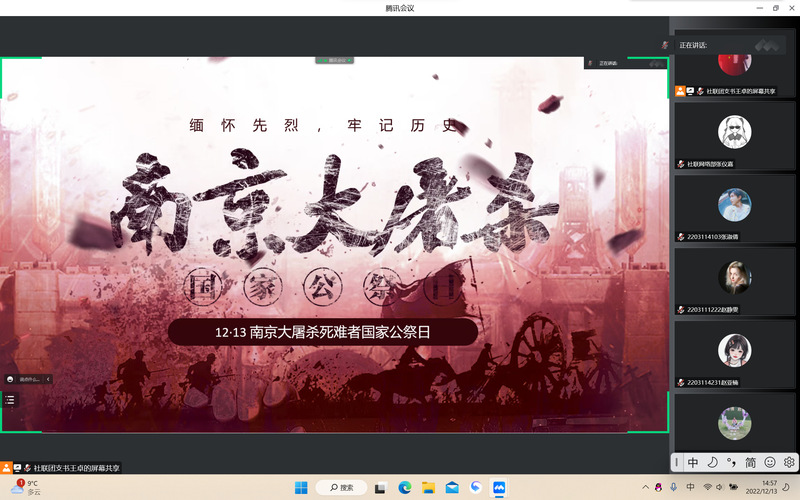 为致敬英雄、缅怀先烈,让学生更深切地体会到国家统一强大进而激励自身赓续精神、砥砺前行,12月13日,化学化工学院社团联合发展中心于腾讯会议线上平台举办“国家公祭日——缅怀先烈,牢记历史”主题团日活动。此次活动由2020级本科生王卓主持。 活动伊始,全体同学为南京大屠杀死难者同胞默哀一分钟。接着,主持人介绍南京大屠杀的历史背景以及日军的罪恶行径,并通过播放纪录片的方式让同学们更加切实地感触历史。随后,主持人讲述国家公祭日的设立过程,并详细介绍首次公祭日的流程,给同学们留下了深刻的印象。最后,主持人讲述国家公祭日的深远影响,播放视频并对本次活动进行总结,指出“国家公祭日是群众路线的生动体现,体现的是对群众的尊重,是对生命的敬畏”,并告诫同学们“勿忘国耻,振兴中华”。 昭昭前事,惕惕后人,勿忘国耻,振兴中华。本次团日活动的顺利开展,不仅帮助同学们深刻了解国家公祭日,牢记历史、珍惜和平,同时也鼓励同学们抱有强烈的忧患意识与民族自尊心,担当时代责任,锤炼品德修为,为祖国强大与民族复兴而不懈努力。 (化学化工学院 孙璐瑶 王思嘉) |
