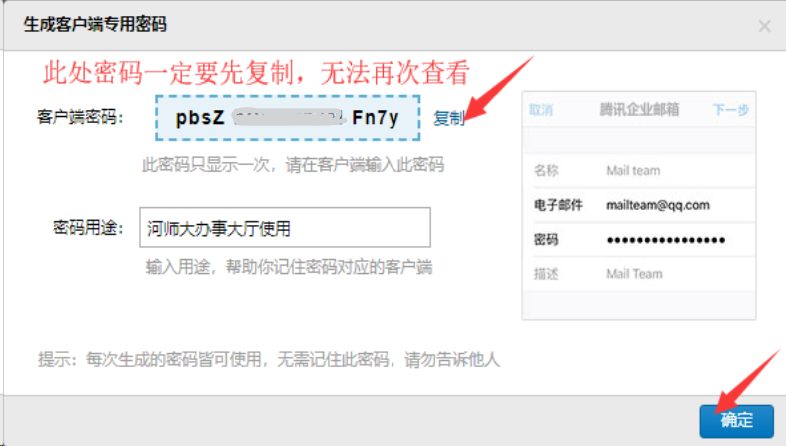 第四步:生成客户端密码后,在办事大厅中、OA系统或者个人Foxmail、Outlook中使用邮箱账号和邮箱客户端密码绑定。(邮箱客户端密码是固定不变的,永久生效,使用后,即使更改WEB邮箱登录密码,也不会影响相关邮箱客户端绑定。)