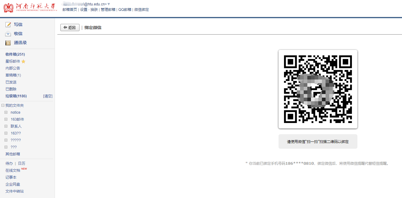 第一步:在个人邮箱中,点击“微信绑定”。按照页面提示,扫描二维码,绑定个人微信。