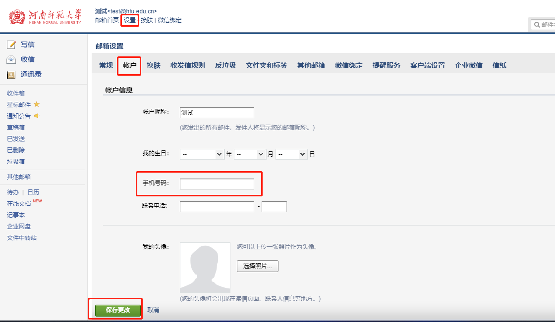 登录校园邮箱网页端-左上角“设置”-“账户”-“手机号”,填写真实在用手机号“保存”即可。步骤如下图: