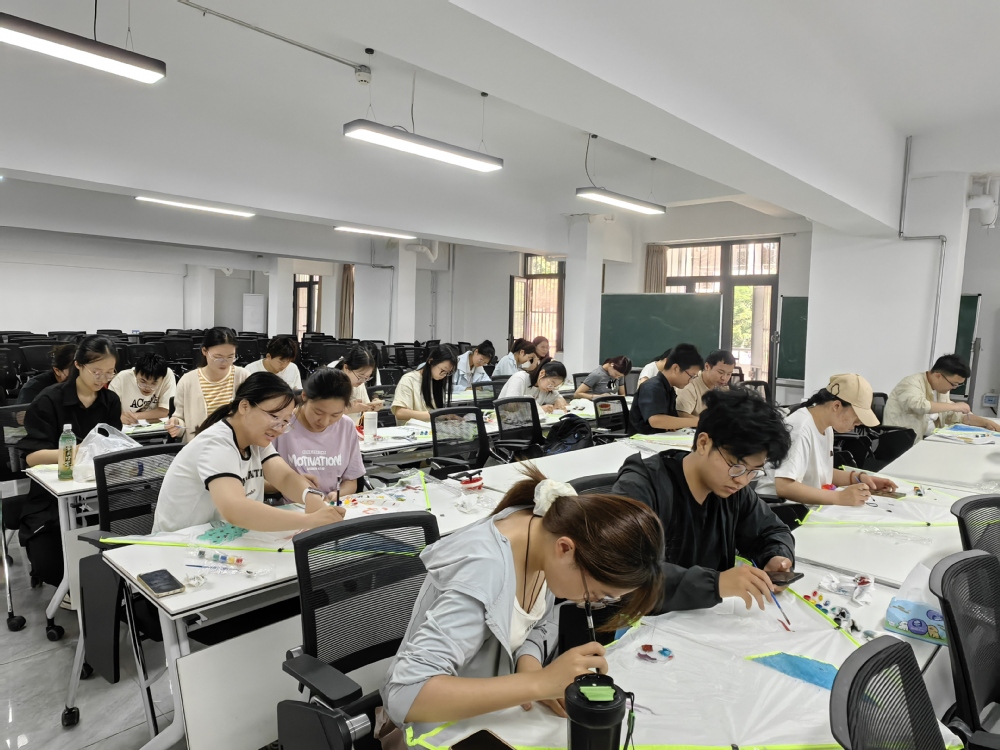 同学们在领取空白风筝与绘画工具后,与同伴一起合作,开启创意之旅。有人用明快的蓝黄撞色描绘“理想星空”,有人以水墨笔触勾勒校园风景,还有同学将烦恼化作抽象符号,用画笔尽情宣泄。 “画风筝时,感觉焦虑随着颜料一起被涂抹掉了!”一位同学感慨道。