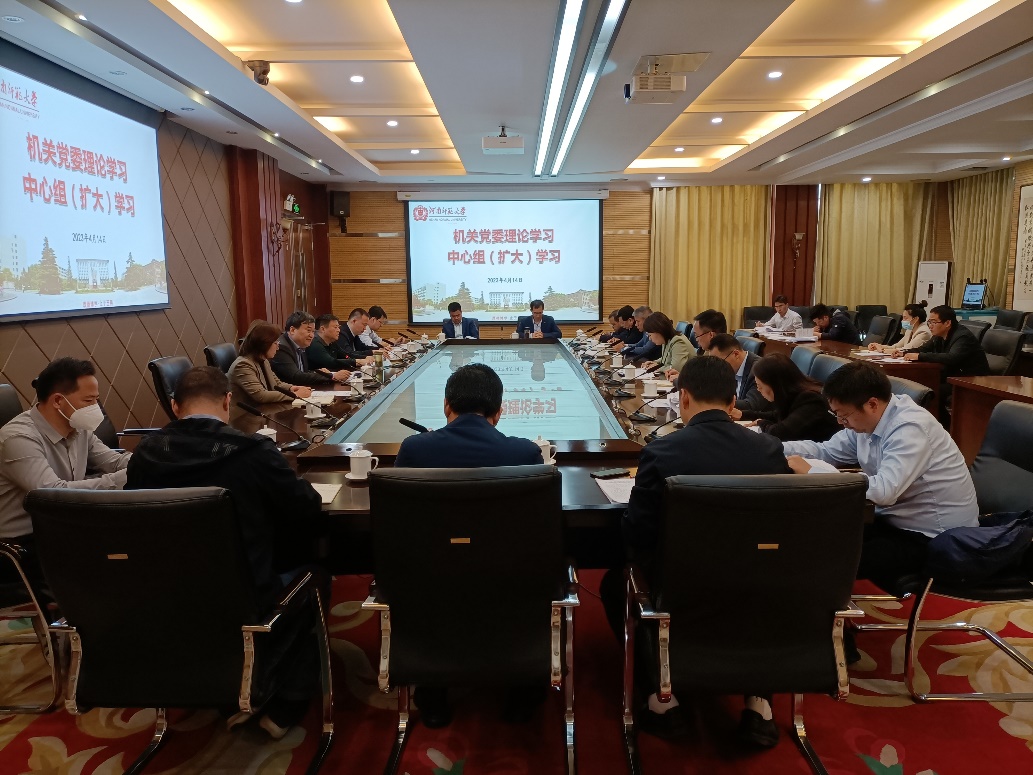 4月14日上午,机关党委在勤政楼第三会议室召开理论学习中心组(扩大)学习会议,传达学习贯彻习近平新时代中国特色社会主义思想主题教育会议精神。机关党委委员、各党支部书记参加学习。会议由校党委统战部副部长、机关党委副书记张晨寒主持。