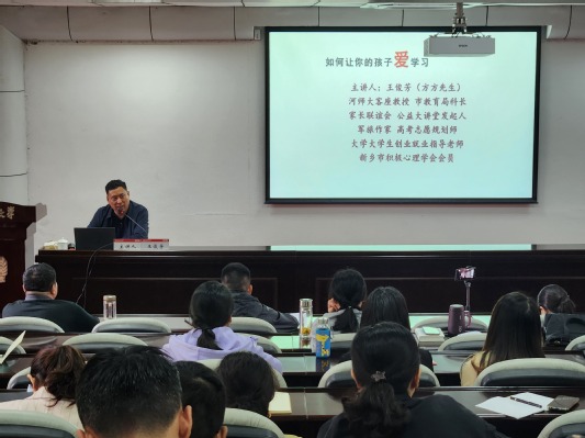王俊芳老师从“夫妻关系、书香家庭、家校共育、开窍工程、资源开发”五个方面讲解如何让孩子爱上学习,他用果树成长理论类比促进孩子学习的家庭因素—以树根类比夫妻关系、土壤类比书香家庭、树干类比家校共育、树枝类比开窍工程、树叶类比资源开发,通过实际案例分析、知识技巧讲授、疑问互动多种形式生动形象的介绍了这五个纬度因素如何影响孩子学习。他强调家长需要改变观念,做到“不强迫不纵容不忽略”孩子,协调平衡亲子关系、要明确家庭教育与学校教育的地位同等重要。同时,他从新乡市家庭教育的实际出发展望未来,传播经验和智慧,为焦急备战中考的家长撒下一场及时雨,并建议培养孩子的核心竞争力,让孩子赢在未来。讲座在教职工的热烈的掌声中落下帷幕,教职工纷纷提出自己日常的教育困惑,王老师对教职工的提问进行详尽解答,帮助大家排疑解惑。