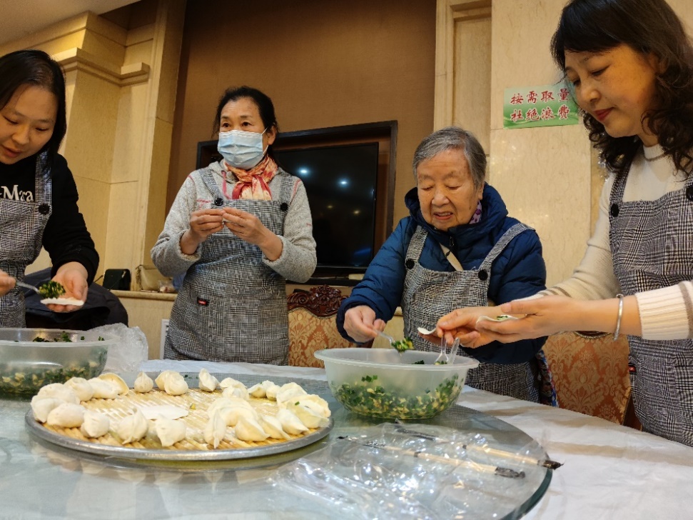 一摞摞饺子皮、一盆盆饺子馅,材料准备齐全后,志愿者有的和面、有的擀皮儿,和老人们一起包起饺子。大家讲述各自包饺子的方法,分享生活中的点点滴滴。一排排外形精美的饺子, 或元宝状、或小鱼状、抑或月牙状。热腾腾的饺子,暖洋洋的心,活动现场欢声笑语不断,处处洋溢着“家”的味道,“家”的温馨。