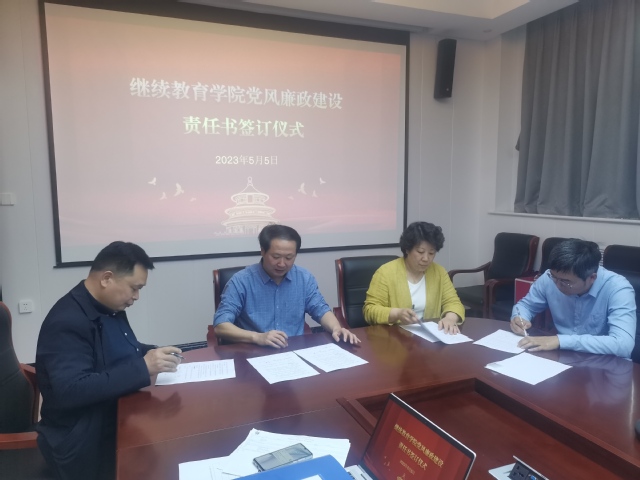 为进一步落实党风廉政建设责任制,5月5日下午,学院2023年度党风廉政建设责任书签订仪式在二楼会议室举行,学院班子成员、各科室负责人、科级干部参加,会议由党总支书记张喜平主持。