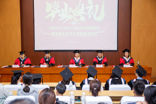 7月5日上午,河南师范大学2025届高等学历继续教育毕业典礼暨学士学位授予仪式在生命科学学院报告厅隆重举行。毕业典礼采取线上线下同步方式进行,学校学位评定委员会部分委员、继续教育学院相关领导、教师代表、毕业生代表出席了典礼现场,各校外教学点设置分会场,万余名毕业生在线观礼。典礼由继续教育学院副院长李醒东主持。