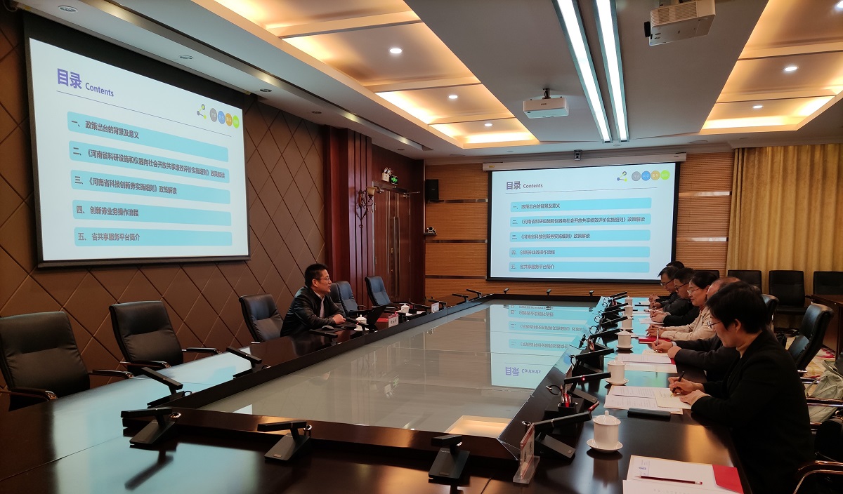 111日上午,河南省科研设施与仪器共享服务平台主任刘朝科、市场部主任张红波到我校进行“河南省科研仪器共享政策解读及科技创新券实务操作”政策宣讲。宣讲会在勤政楼第三会议室举行,会议由科技处副处长赵旭主持。分析测试及实验动物研究中心、科技处、国有资产与实验室管理处负责人,各学院大型仪器中心负责人及部分教师代表参加了会议。