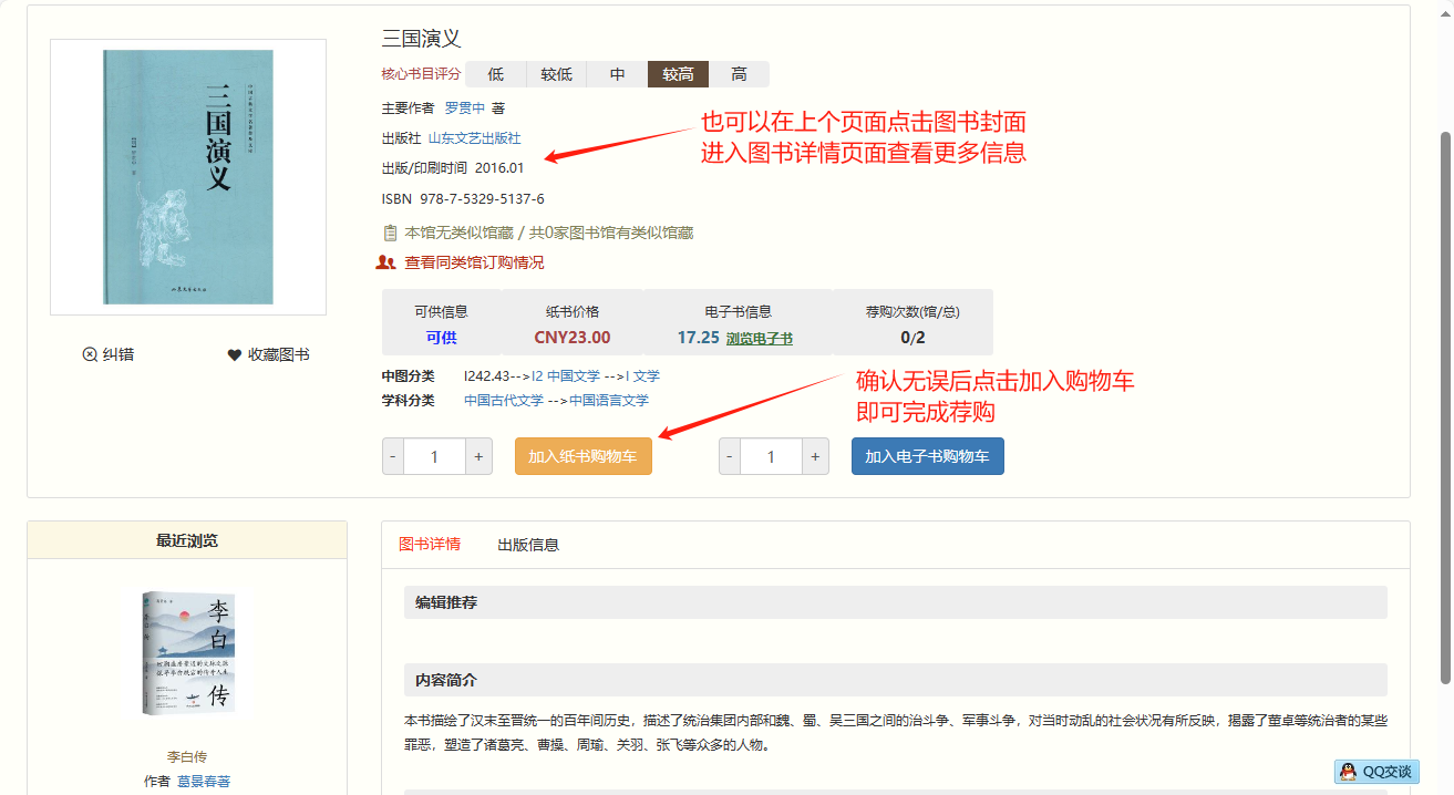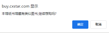 步骤三:点击纸书荐购后,即完成了本书荐购。若提示本馆纸书馆藏有类似图书,则说明图书馆已购买本书,请到书库借阅;如确有需求且不能借到此书,请根据实际情况加购。