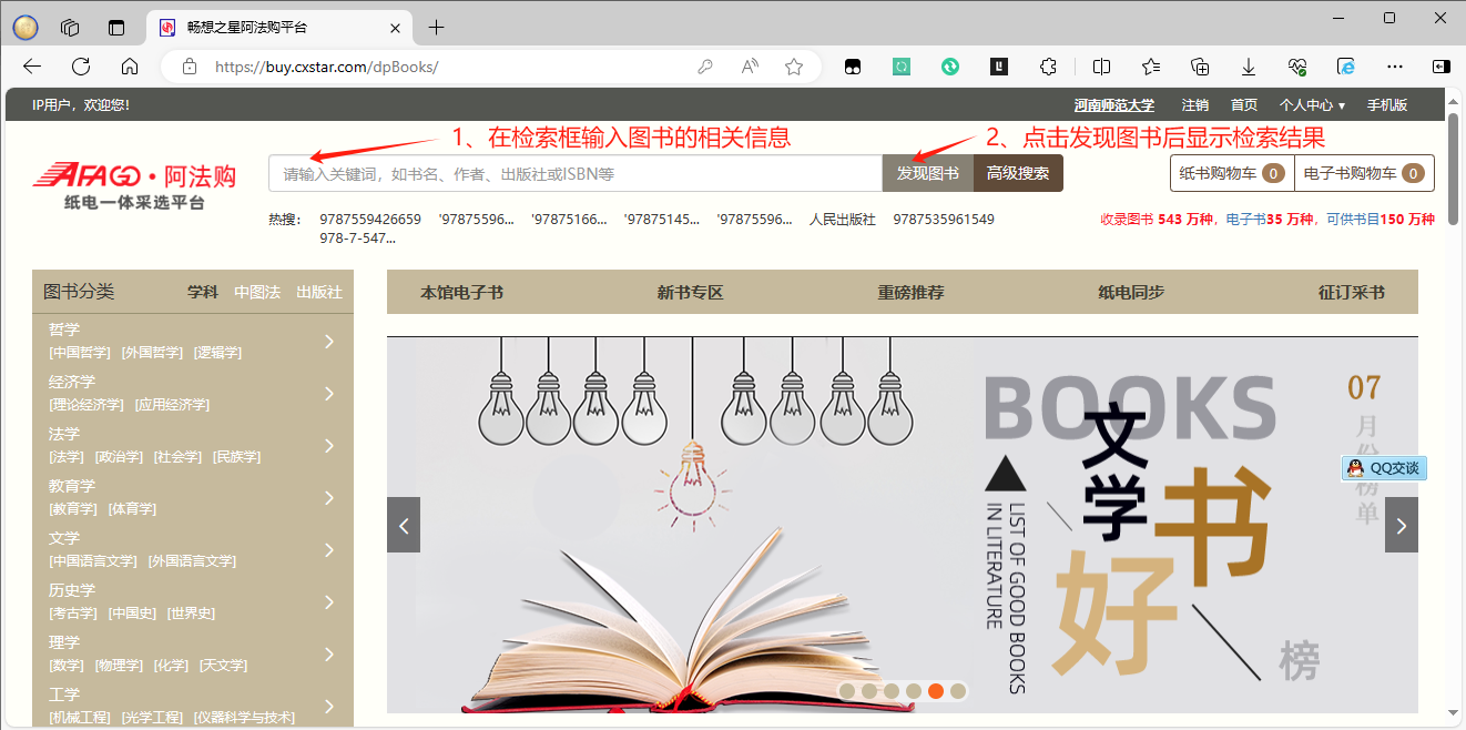 步骤一:校园网范围内登陆网址: https://buy.cxstar.com/dpBooks/?pinst=1,免账号密码登录自动识别为IP用户,暂不支持非校园网用户登录。