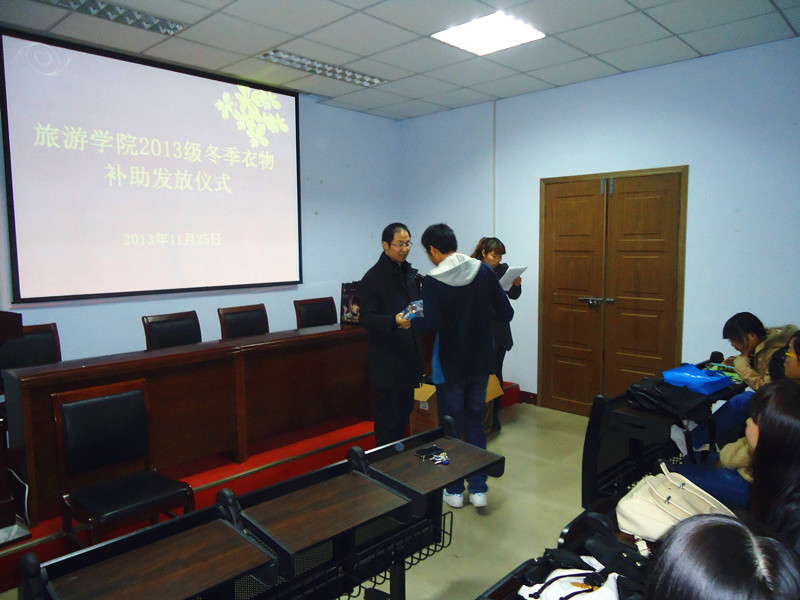 情暖寒冬,爱在旅游。2013年11月25日下午,旅游学院在第二会议室举行冬衣补助发放仪式,暖暖的笑容洋溢在每个人的脸上,出席此次活动的有旅游学院党总支副书记高飞、2013级辅导员耿妍老师及旅游学院2013级23名贫困生。
