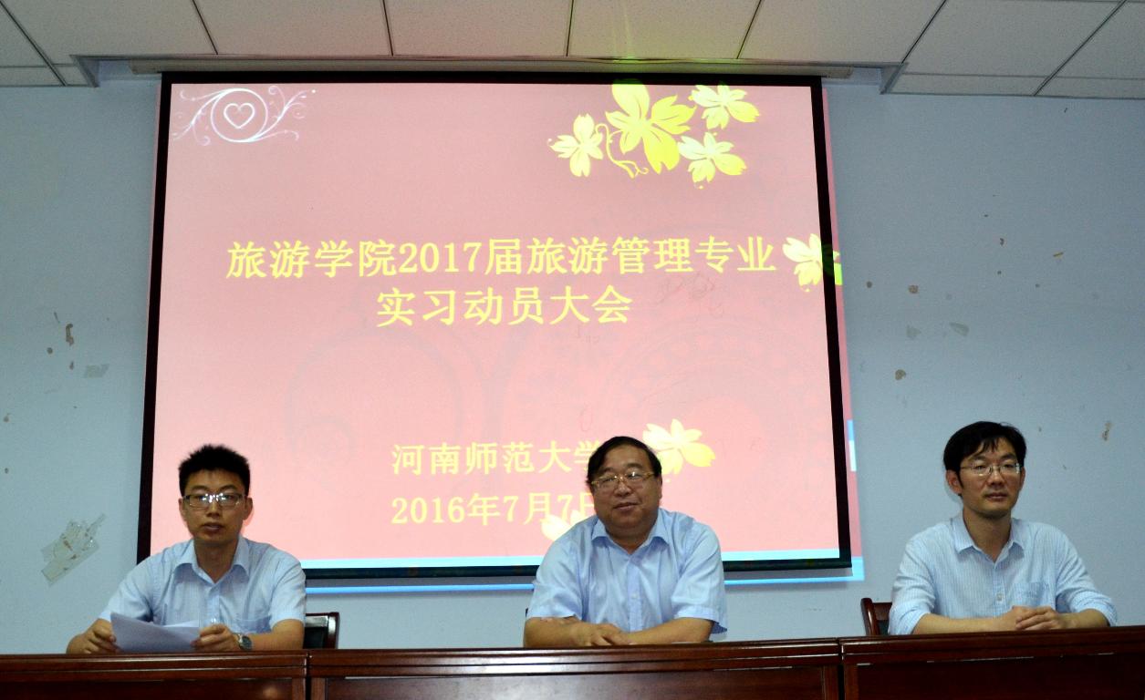 7月8日上午8点,河南师范大学旅游学院在琢玉楼第二会议室举行了2017届旅游管理专业实习动员大会。院长赵成福,党总支副书记吴耀武,教学副院长李伟、全体实习指导老师以及13级全体实习学生共同参加了此次动员大会。会议由2013级辅导员耿妍老师主持。