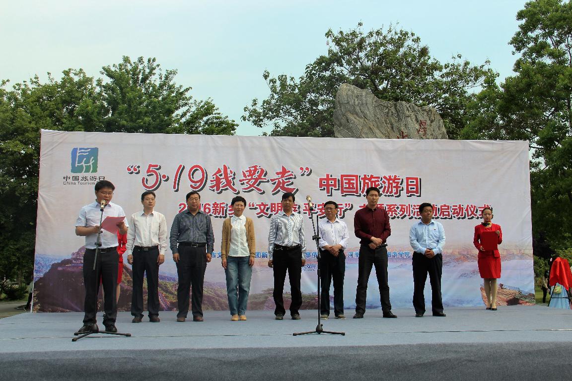 5月19日上午,由市综治办、市文明办、共青团新乡市委、市外事侨务旅游局、河南师范大学旅游学院主办、腾讯大豫网协办的2016新乡“文明游,平安行”主题系列活动启动仪式于我校中心花园校训石前举行。新乡市政府办公室副主任孙传勇、文明办副主任常中宜、外事侨务旅游局党组书记及局长崔红、我院党委书记孙昌松、院长赵成福作为领导嘉宾莅临了此次启动仪式。新乡市4A级以上景区、重点旅行社均参与了此次活动。腾讯大豫网、新乡日报、新乡广播电视台等媒体全程参与,我院首批文明旅游志愿者和2014、2015级学生到场观摩学习。
