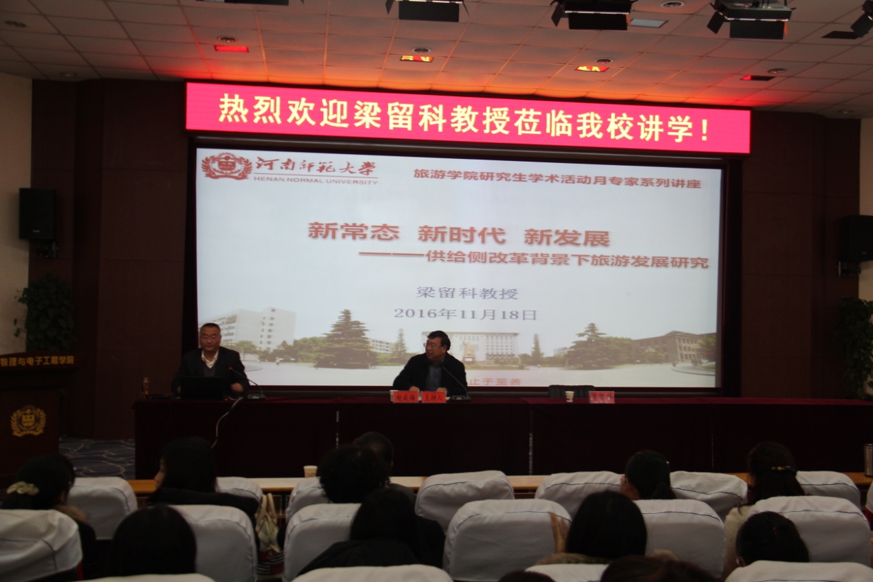 11月18日上午,应河南师范大学旅游学院邀请,洛阳师范学院校长梁留科教授莅临我校讲学。梁教授在物理北楼三楼报告厅作了 “新常态 新时代 新发展——供给侧改革背景下旅游发展研究” 的主题报告。报告由旅游学院院长赵成福主持,学院相关领导、部分教师、研究生、本科生等360余人聆听了报告。