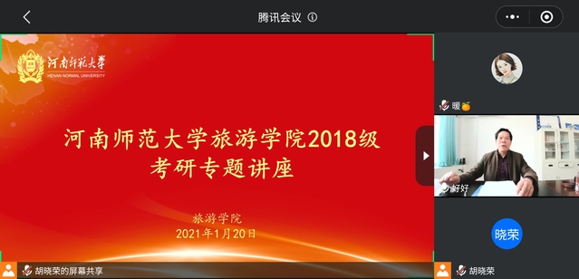 为进一步帮助同学们指点考研迷津,科学备考,1月20日下午,旅游学院通过腾讯会议开展了考研专题讲座。本次讲座由河南师范大学网络中心院副主任梁书斌老师主讲,2018级辅导员以及全体学生参加了此次讲座。
