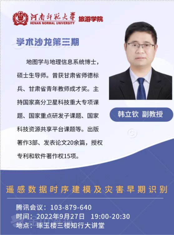 主讲人简介:韩立钦,地图学与地理信息系统博士,硕士生导师。曾获甘肃省师德标兵、甘肃省青年教师成才奖。主持国家国家高分子卫星科技重大专项课题、国家重点研发子课题、国家科技资源共享平台课题等。出版著作3部,发表论文20余篇,授权专利和软件著作权15项。