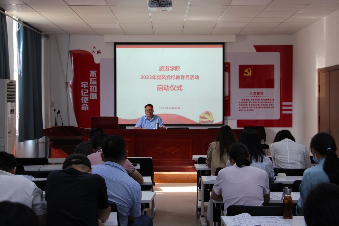 6月6日下午,旅游学院在多功能报告厅召开2023年党风党纪活动月活动启动仪式。院领导、全体教师党员参加。启动仪式由院党委书记冯峰主持。