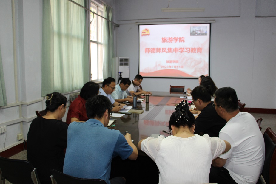 7月14日下午,旅游学院在综合教研室组织师德集中学习教育,院领导班子成员、科级干部、教师等通过线上线下相结合的方式参加。旅游学院院长刘英基领学,院党委书记冯峰主持并讲话。