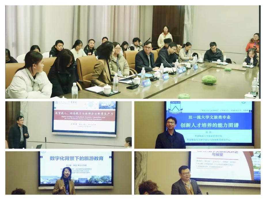 来自北京第二外国语学院的唐承财教授率先以《国内外数字文旅研究评述与展望》为题做主旨报告。唐教授在报告中深入解析了新质生产力、数字文旅与乡村振兴之间的紧密联系。他指出,数字文旅在新质生产力发展进程中起到独特推动作用,且对乡村振兴有着不可忽视的战略意义,他通过对国内外数字文旅研究的详尽评述,为研究者明晰了发展现状并展望了未来发展趋势。接着,华南师范大学刘俊教授以《双一流大学文旅类专业创新人才培养的能力图谱》为主题做报告,围绕如何培养负责任的文旅创新者展开阐述,特别强调了创新的主导地位,并深入探讨了“旅游+教育”模式,为双一流大学文旅类专业人才培养路径提供了新的探索方向。中国地质大学(武汉)李江敏教授带来《数字化背景下的旅游教育》主题报告。李教授聚焦于“文化+旅游”的融合走向以及数智文旅课程建设等核心内容,强调在数字化浪潮之下,旅游教育融合文化特色、构建数智文旅课程体系具有的重要性与紧迫性。河南师范大学刘英基教授围绕《数智嵌入、动态能力与旅游企业新质生产力》进行报告。刘教授深入剖析了“数智+旅游”模式如何提升旅游企业的动态能力以催生新质生产力,为旅游企业在数智化变革进程中的发展提供了深层次思考。