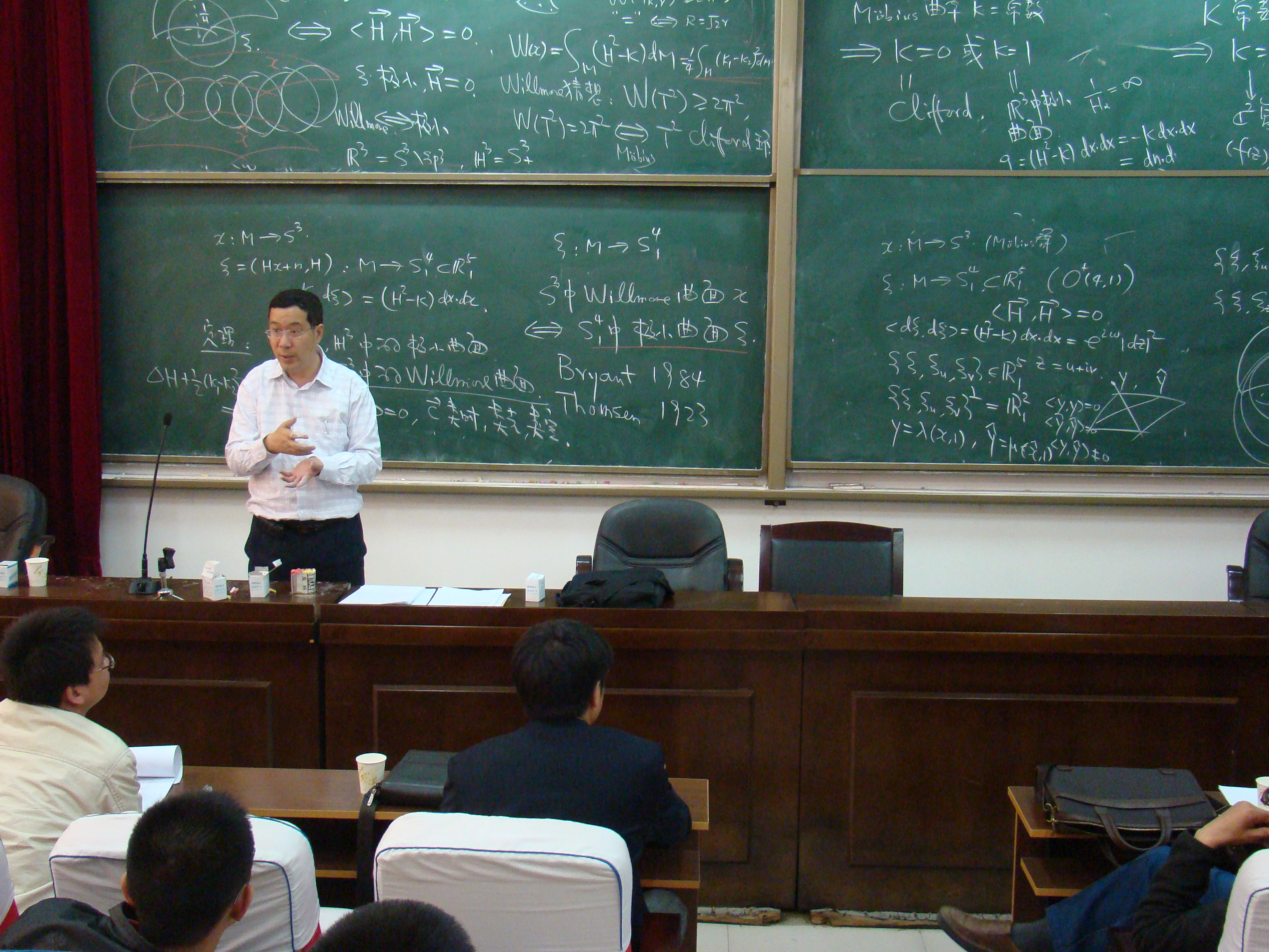 2011年4月18-20日,中国数学学会秘书长、长江学者、杰出青年基金获得者、北京大学数学科学学院院长王长平教授在数学学院报告厅为我校师生做系列学术报告,题目为:Sn中m维定向球面的模空间和Möbius变换群、Sn中子流形的Möbius微分几何、S3中的圆纹Willmore曲面的研究。
