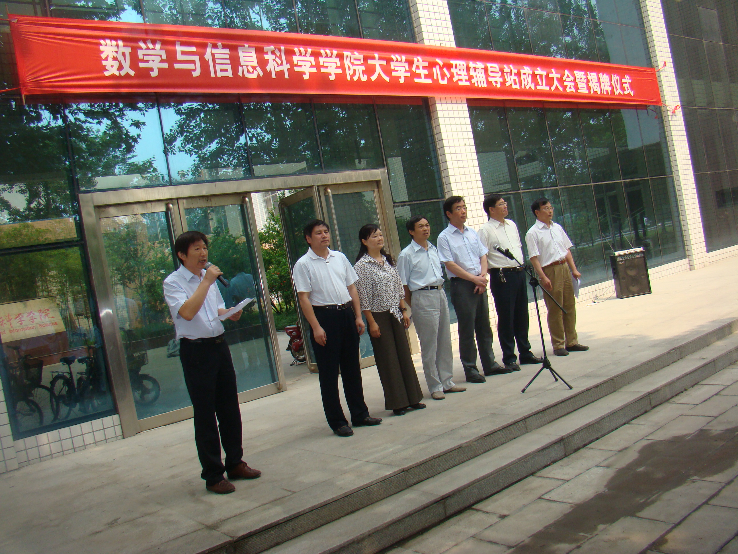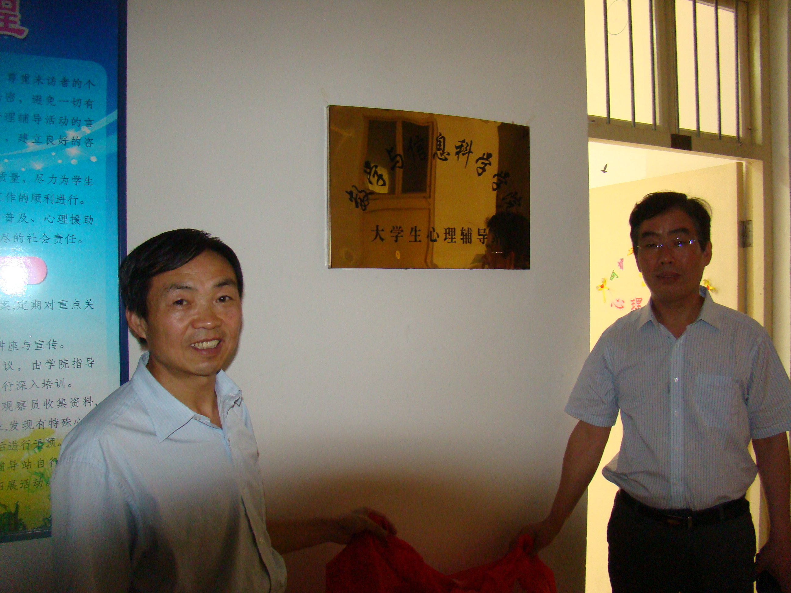 在热烈的掌声中,王海旺副书记和孙先科副校长共同为数学与信息科学学院大学生心理辅导站揭牌,标志着我校首个二级心理辅导站正式成立!王书记在揭牌仪式上发表讲话,他对二级心理辅导站的成立表示祝贺,充分肯定了二级心理辅导站的成立对学校学生心理健康工作的重要推动作用,并指出,二级心理辅导站的建立,是完善学校、学院、班级、宿舍的校园四级心理健康网络体系的一大举措,体现了以学生为本的现代教育理念,它既是为学生解决心理困惑的机构,也是在新形势下学生思想政治工作向深层次延伸的重要载体,为大学生的健康成长搭建了一个“答疑解惑、优化心理、促进成长、构建和谐”良好平台。王书记随后在实地查看指导学院大学生心理辅导站办公地点时指出,希望学院进一步加强与校大学生心理健康教育中心的联系,进一步完善二级心理辅导站的硬件软件建设,规范相关工作制度和人员安排,努力把大学生心理辅导站建成一个重要的信号站——心理上出现问题的同学能尽早发现和干预;一个出色的互助站——心理上需要帮助的同学能得到抚慰和呵护。