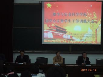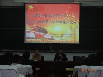 为进一步加强学生会干部队伍建设,促进学生工作更好更快地发展,4月14日晚八点,数学与信息科学学院于院多功能报告厅隆重召开团学会议暨学生干部调整大会。院党委副书记李富杰、团委书记苗山根出席了本次大会,2012、2013、2014届院学生会成员及2011、2012级各班班长、团支书参加了大会。