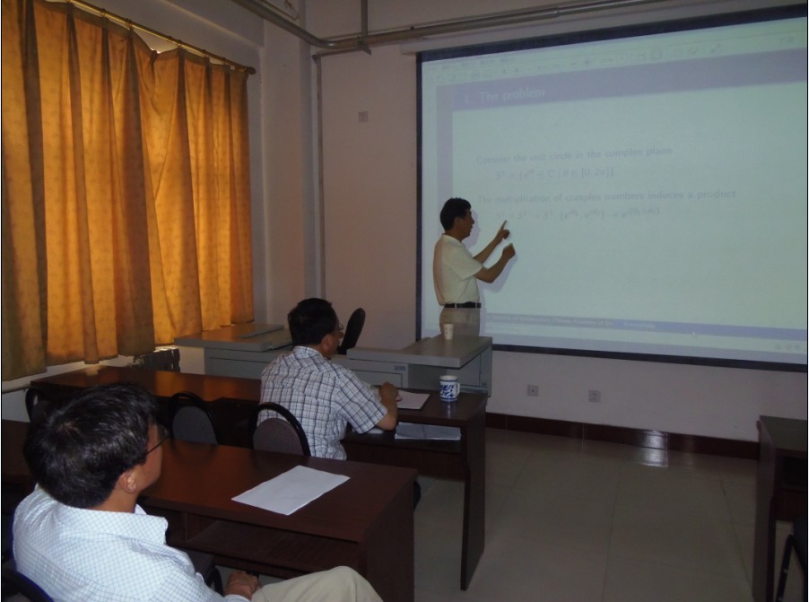段海豹教授首先通过圆周群的基本概念阐述了将拓扑流形转化为代数运算的观点,给出了把圆周作为流形的商空间是否正则的概念,并举了一些实例作为佐证;然后由例子出发引出了流形上是否存在正则的圆周群以及如何对流形上不同的正则圆周群进行分类等公开问题;最后在介绍了代数拓扑中的同调论等一些基本知识后回顾了上述公开问题的一些进展,并介绍了他就上述问题在5维流形上的最新研究成果以及证明思想。报告中,段海豹教授展示了数学的美妙,用自身经历说明了科研能力的培养需要扎实的基本功和勤奋的治学精神,扩大了老师们和同学们的眼界,大家一致表示受益匪浅。