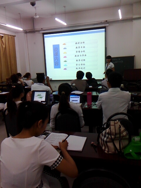 各名参赛学生均以准确生动的语言,配以新颖明了的PPT向大家讲述了自己的说课内容,特别是邱培云同学在针对“直线与平面垂直的判定”进行说课时,语言流畅,讲述生动且富有条理,精彩地向大家展示了此节课的教材分析、学情分析、教学目标、教法与学法分析等环节的内容,并最终以优异的成绩摘取了此次比赛的桂冠。