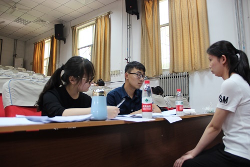 本次面试采用“二对一”的形式:两位负责人面试一位学生,同时增设观众席,学生们轮流面试。每位学生在参加面试的同时,也能够在台下观摩、学习借鉴其他学生的面试表现,取长补短。在面试过程中,负责人提出相应的问题来考察学生对于所加入服务队的态度和想法,据此判断学生的综合素质。其中,在对调研服务队的面试工作中,面试负责人多注重考察学生实际问题的处理,比如:活动紧急却急需处理,如何统筹安排工作,作为队长该如何及时跟进全队的工作进程。面试过程虽紧张严肃,但各位学生都纷纷表明自己的心迹,要用实际行动、踏实的工作态度完成每项任务, 尽职尽责为团队服务。