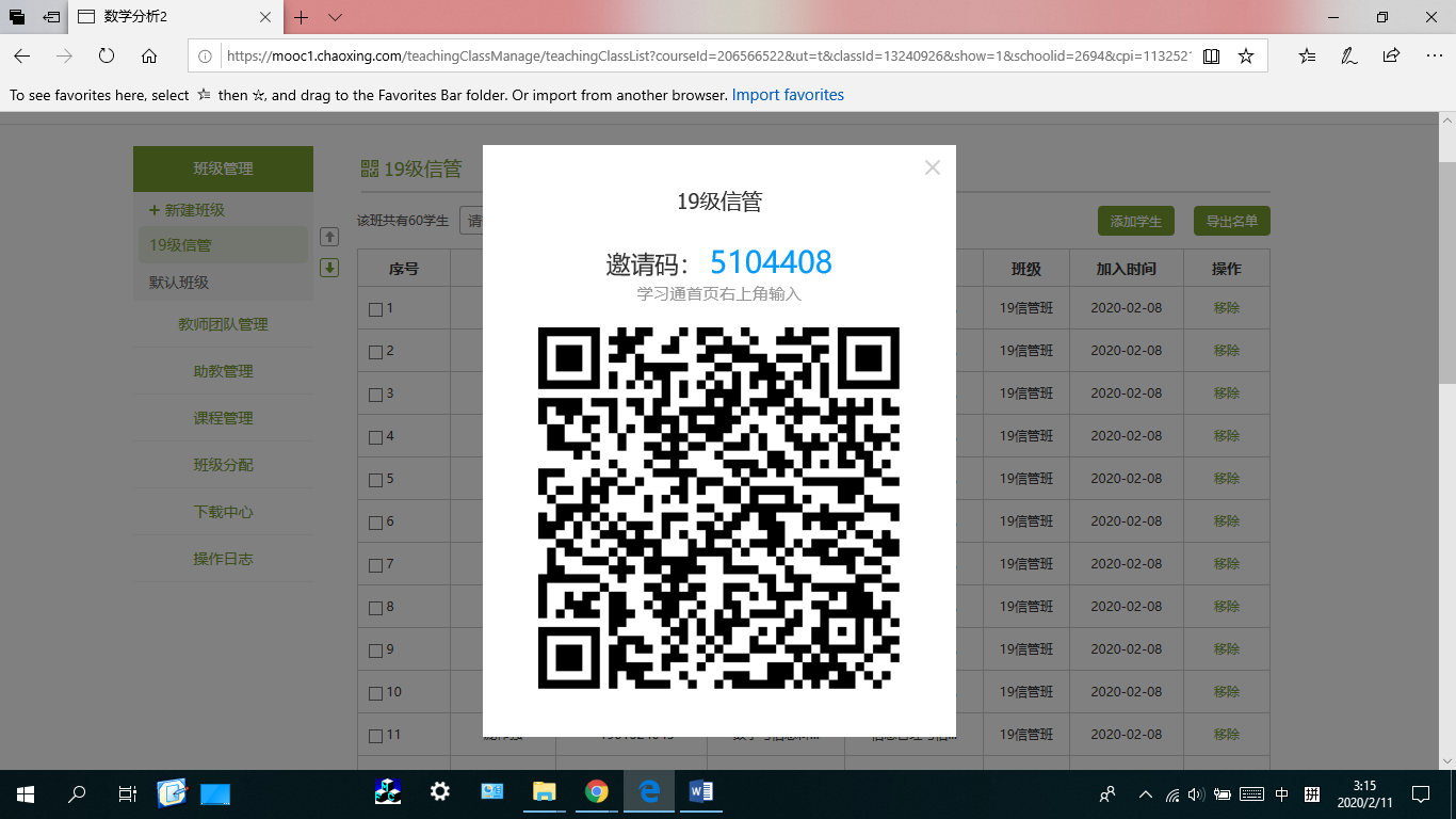 42 | 高等数学 | 19计类1班 | 闫威/超星学习通 | qq | 19级计算机类1班 邀请码: 4241954