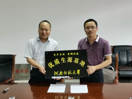 濮阳市第一高级中学副校长孙广文代表濮阳市第一高级中学对我校人员的到来表示热烈欢迎。学院党委副书记李富杰就我校的基本情况、办学特色、专业设置、学科建设及校风学风等情况做了简要介绍。随后,学院副院长黄广月代表我校与濮阳市第一高级中学签订了“河南师范大学优质生源基地合作协议书”,授予濮阳市第一高级中学“优质生源基地”牌匾。