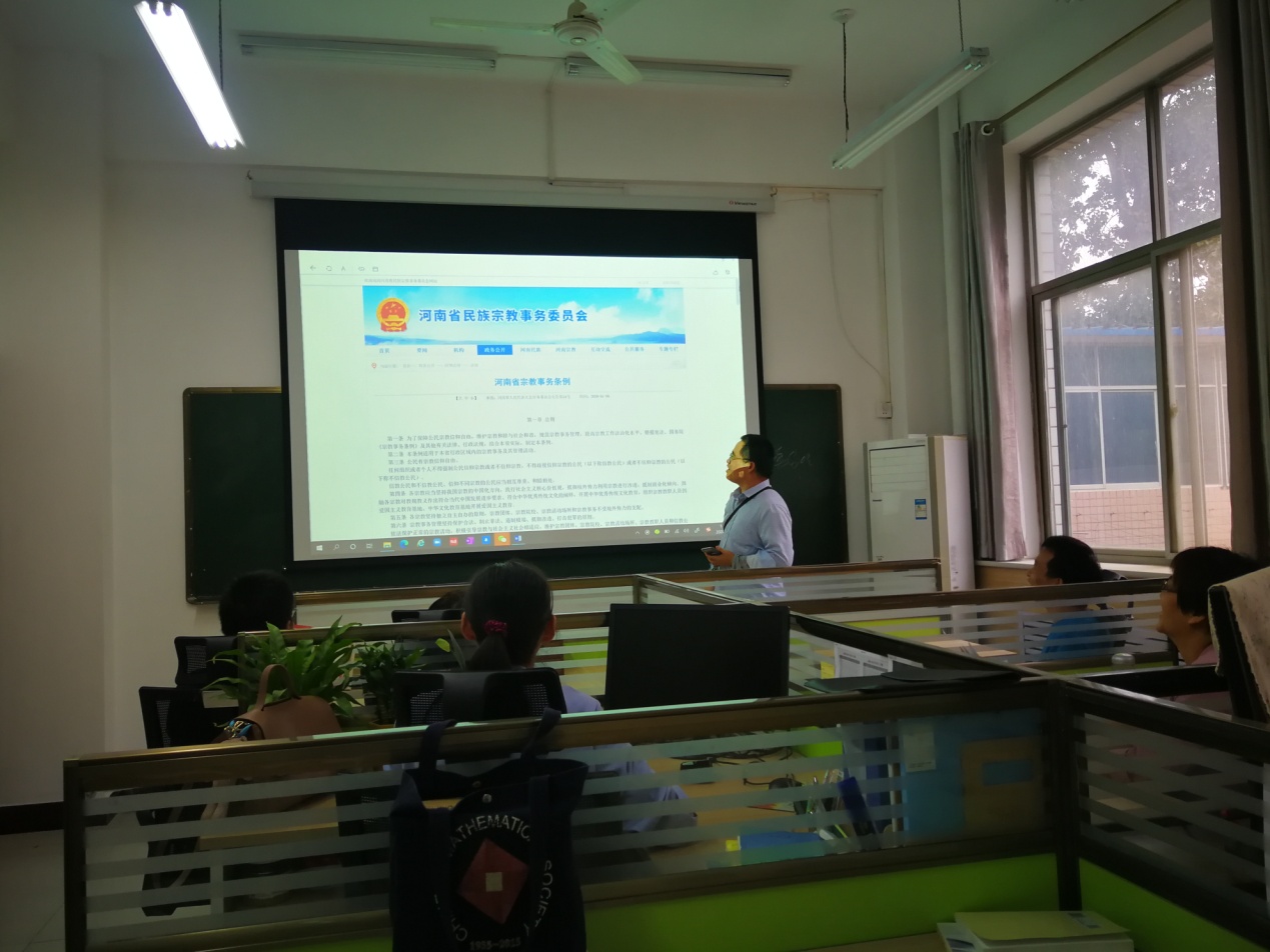 9月29日下午,在院党委统一安排组织下,学院以教研室(科室)为单位开展理论学习活动,认真学习和深入讨论了《河南省宗教事务条例》全文和《高校民族宗教工作知识读本》、《宗教工作政策法规宣传册》中的重点内容。