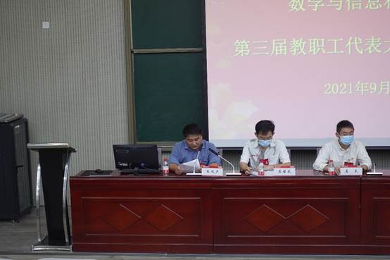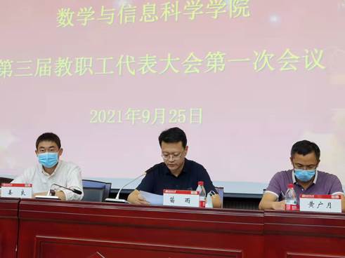 2021年9月25日上午,数学与信息科学学院第三届教职工代表大会第一次会议在学院报告厅隆重举行,会议由院工会主席王凤产主持,39名正式代表参加会议,与会代表按照防疫要求佩戴口罩,保持适当距离。大会审议并一致通过了苗雨院长题为《把握新机遇、探索新举措、实现新发展》的工作报告和《数学与信息科学学院专业岗年终绩效核算办法(试行)》。