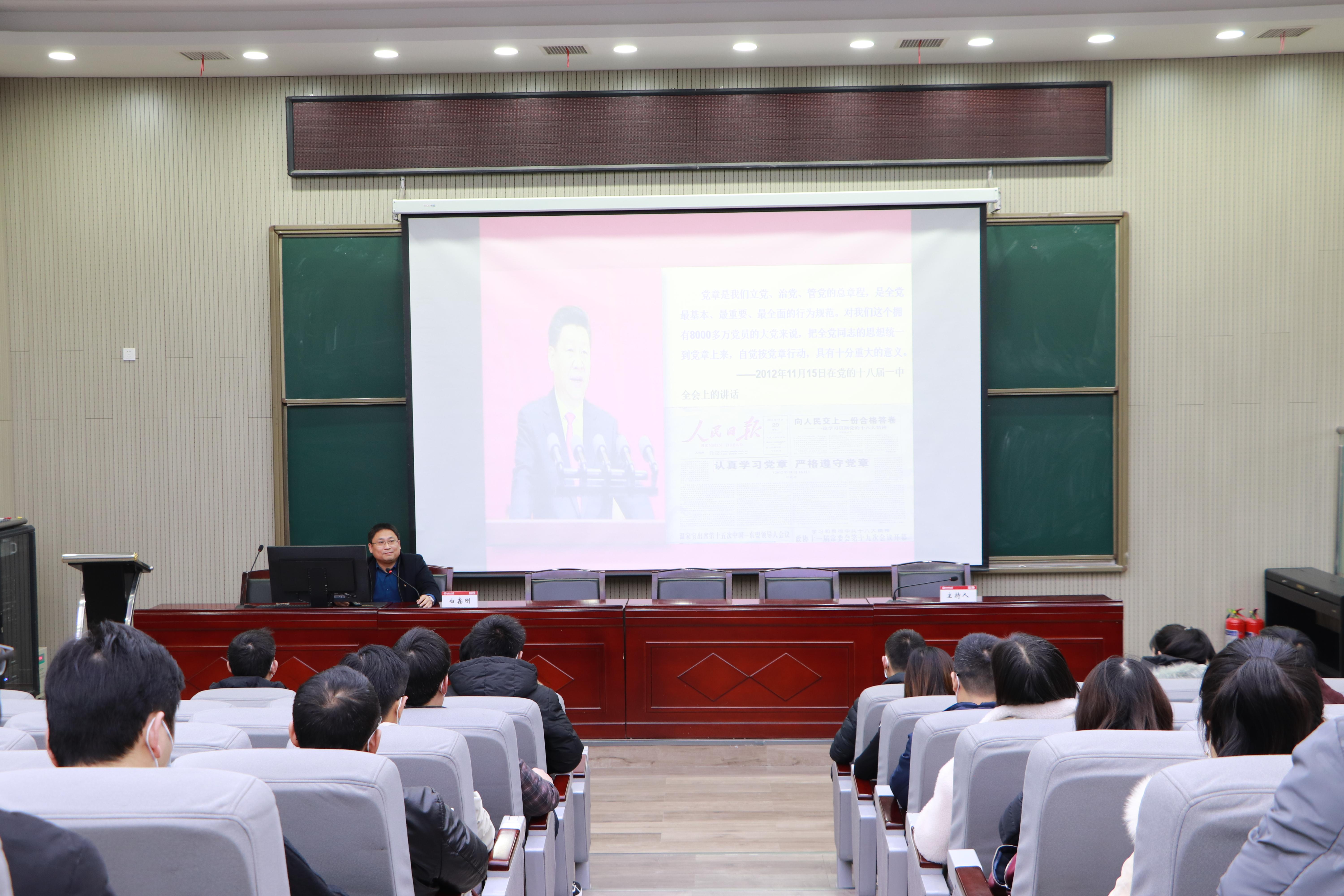 白鑫刚同志首先对十九大党章修订的重点、要点逐一进行了深入细致的解读,带领大家认真学习了新党章的主要内容。他接着围绕新民主主义革命胜利与建立新中国,社会主义制度确立与全面建设,改革开放和开创中国特色社会主义,进入新时代中国特色社会主义四个历史时期,带领大家重温和感受中国共产党百年征程的奋斗与辉煌。他最后强调,党员领导干部应当将学习党章党史作为重要的一课,牢记党员身份、坚定理想信念,心中装着人民,正确对待权力,坚持好干部标准,做忠诚干净担当的党员干部。