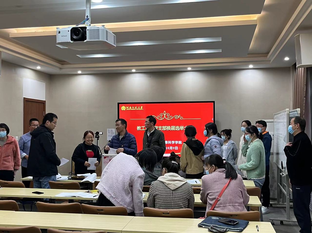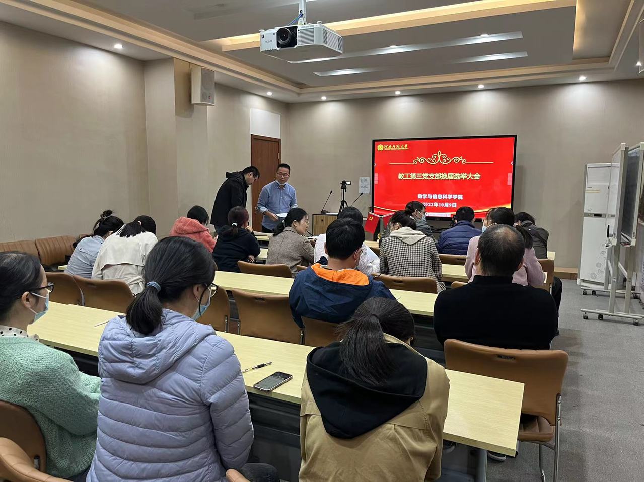 2022年10月9日下午,教工第三党支部在数学南楼103召开党员大会,选举新一届支委会,学院党委委员吴耀武副书记参会。会议由组织委员崔鲁宾主持,共进行5个议程。第一项议程,裴永刚同志汇报本届委员会工作情况,并代表支部委员会述职。第二项议程,通过支部委员会委员候选人名单,第三项议程,通过大会选举办法。第四项议程,通过监票人名单和宣布计票人名单。第五项议程,选举数学与信息科学学院教工第三党支部委员会委员。通过大会选举,最终产生新一届支委:裴永刚,崔鲁宾,李超,并上报上级党委批准。