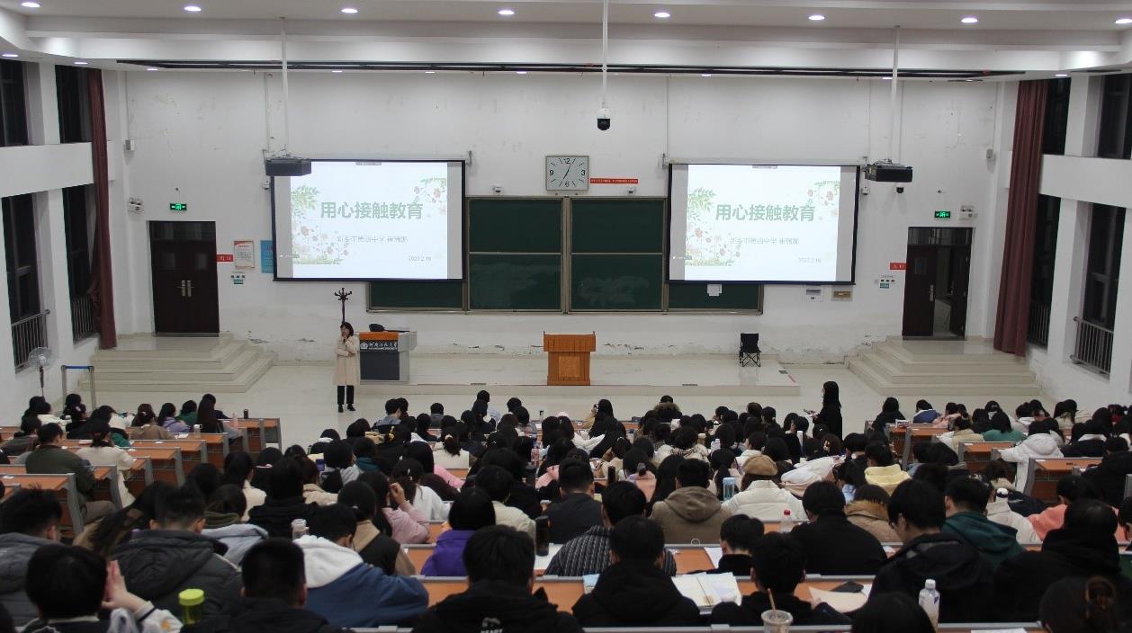 崔瑞娜老师以“用心接受教育”为主题与同学们展开经验分享。首先,她列举了往届实习生的实习经验,分析了实习阶段学生存在的问题,强调了实习的重要性。接着从备课、听课、反思、讲课、课后工作五个方面对实习生实习期间的具体工作展开细致讲解。她指出,教师的教学能力是在不断的反思和对比中提升的,实习生要积极与实习基地指导老师交流沟通,做到择其善者而从之。最后,她以“耕耘不问收获,自有一路花香,只要初心不忘,脚下就是远方”的殷殷期望结束报告。