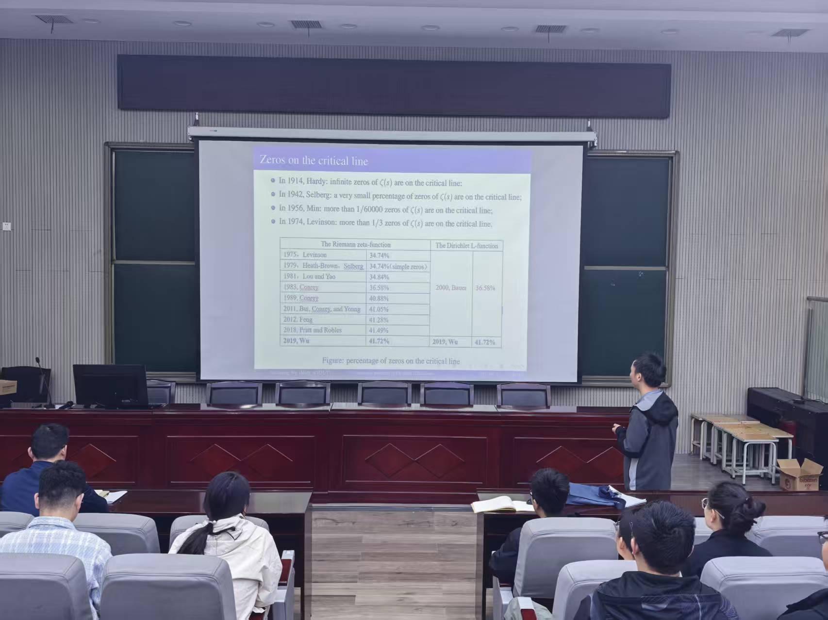 报告中,吴小胜教授从黎曼zeta函数与Dirichlet L-函数的零点分布出发,系统介绍了数学界在证明零点位于临界带内所占比例方面取得的进展,以及在接近黎曼猜想道路上的重要突破。他同时系统阐释了mollifier方法在经典L-函数零点研究中的创新应用。另外,吴教授还深入探讨了关于黎曼zeta函数连续型的高阶矩问题以及着重分析了Dirichlet L-函数的离散型矩问题。为阐明核心理论结果,吴教授详细介绍了研究中所需的关键技术工具:shifted moment方法、除数问题的估计、模形式的谱分解,以及不完全Kloosterman和的双线性形式估计。值得关注的是,他还结合自身科研经验,就数学思维培养和科研选题向在场师生提供了一些宝贵的建议。