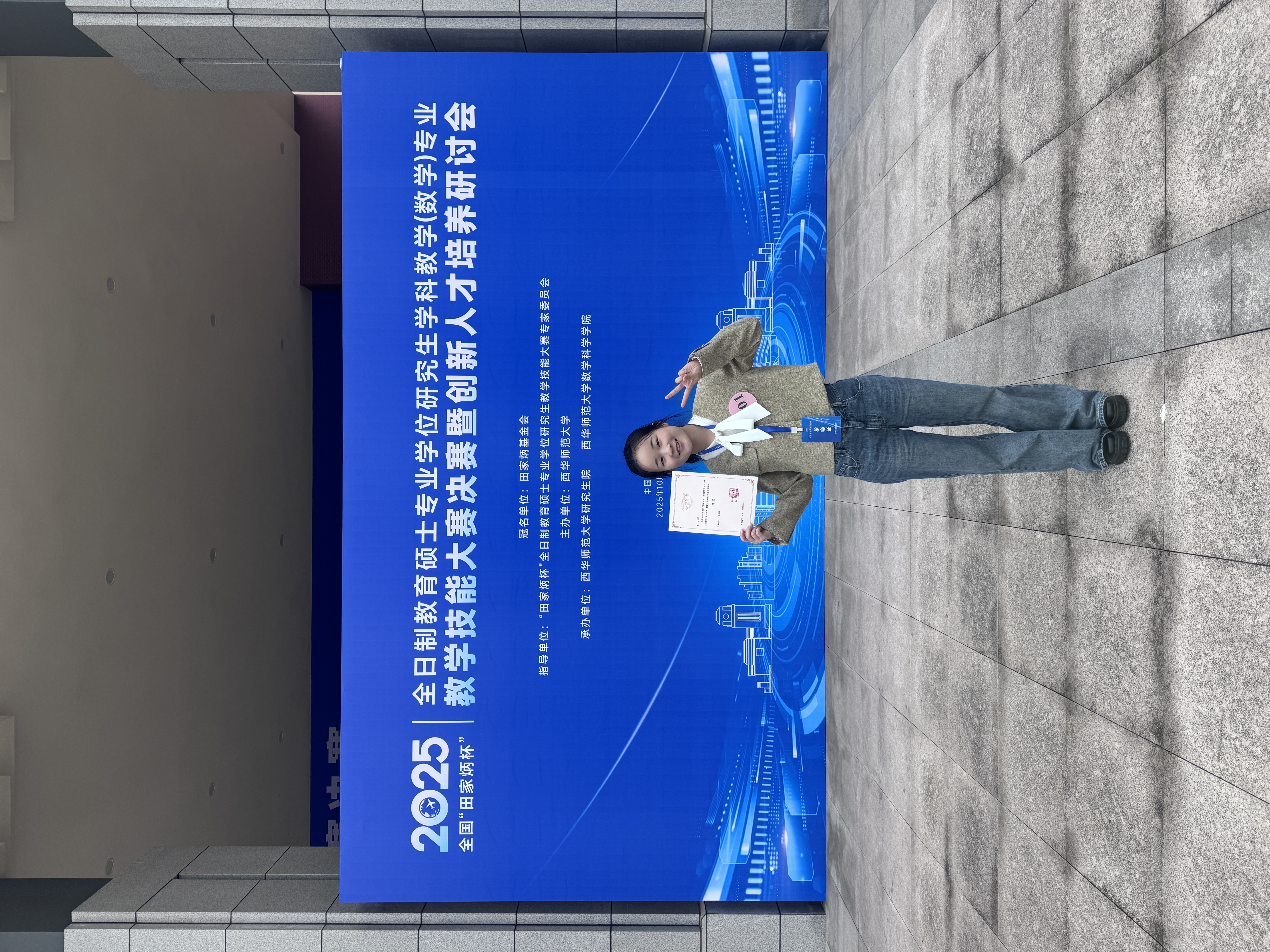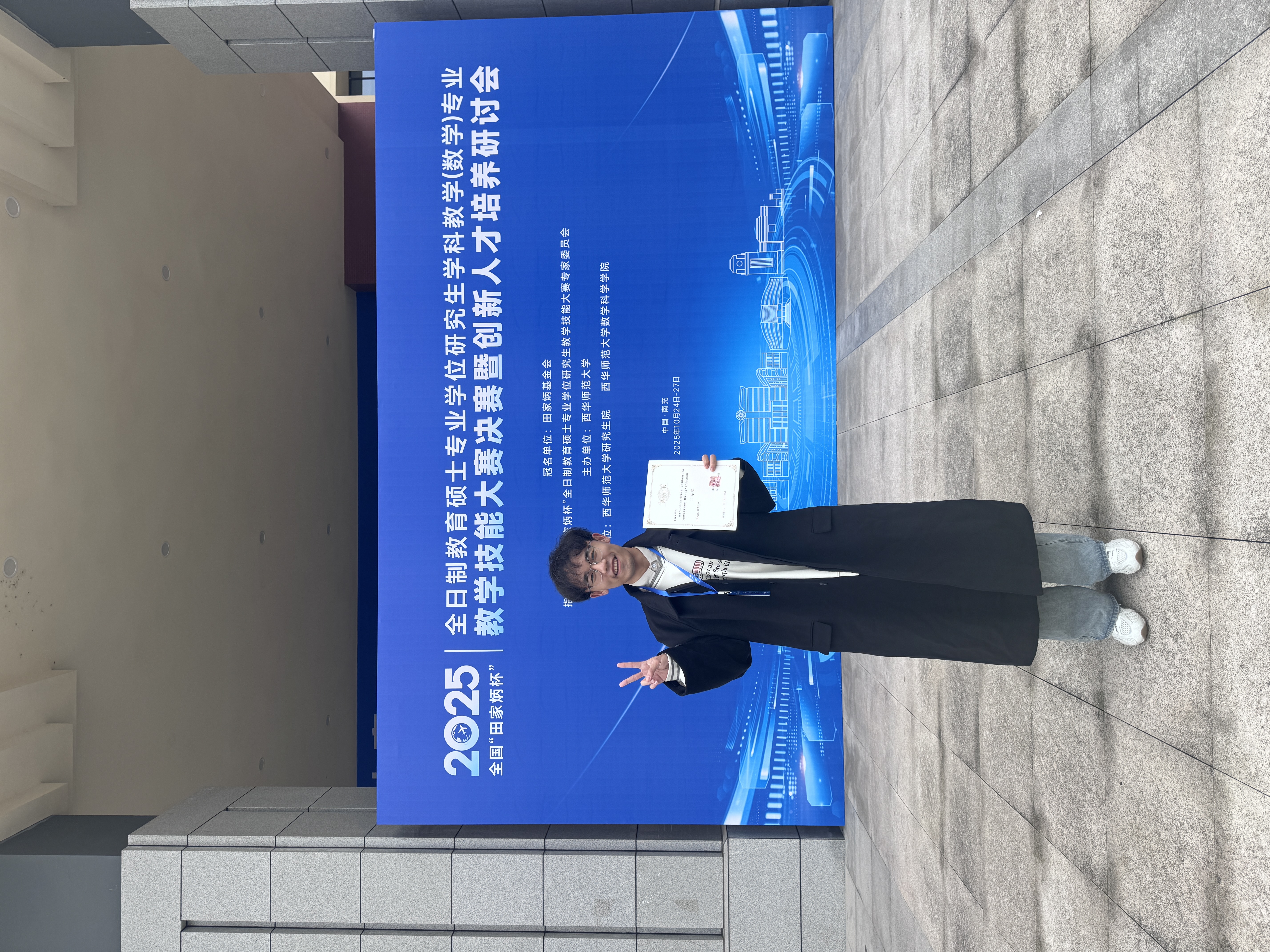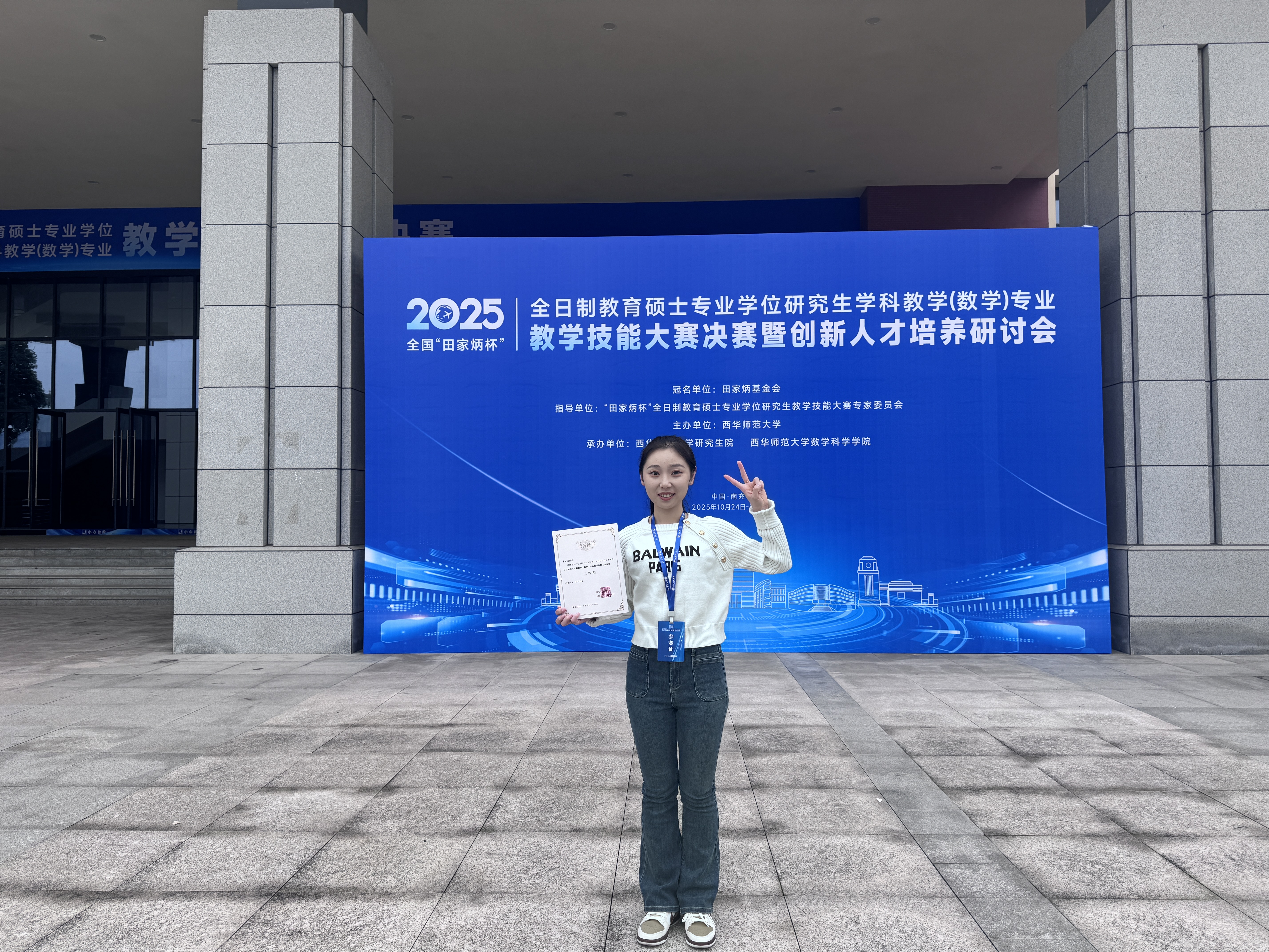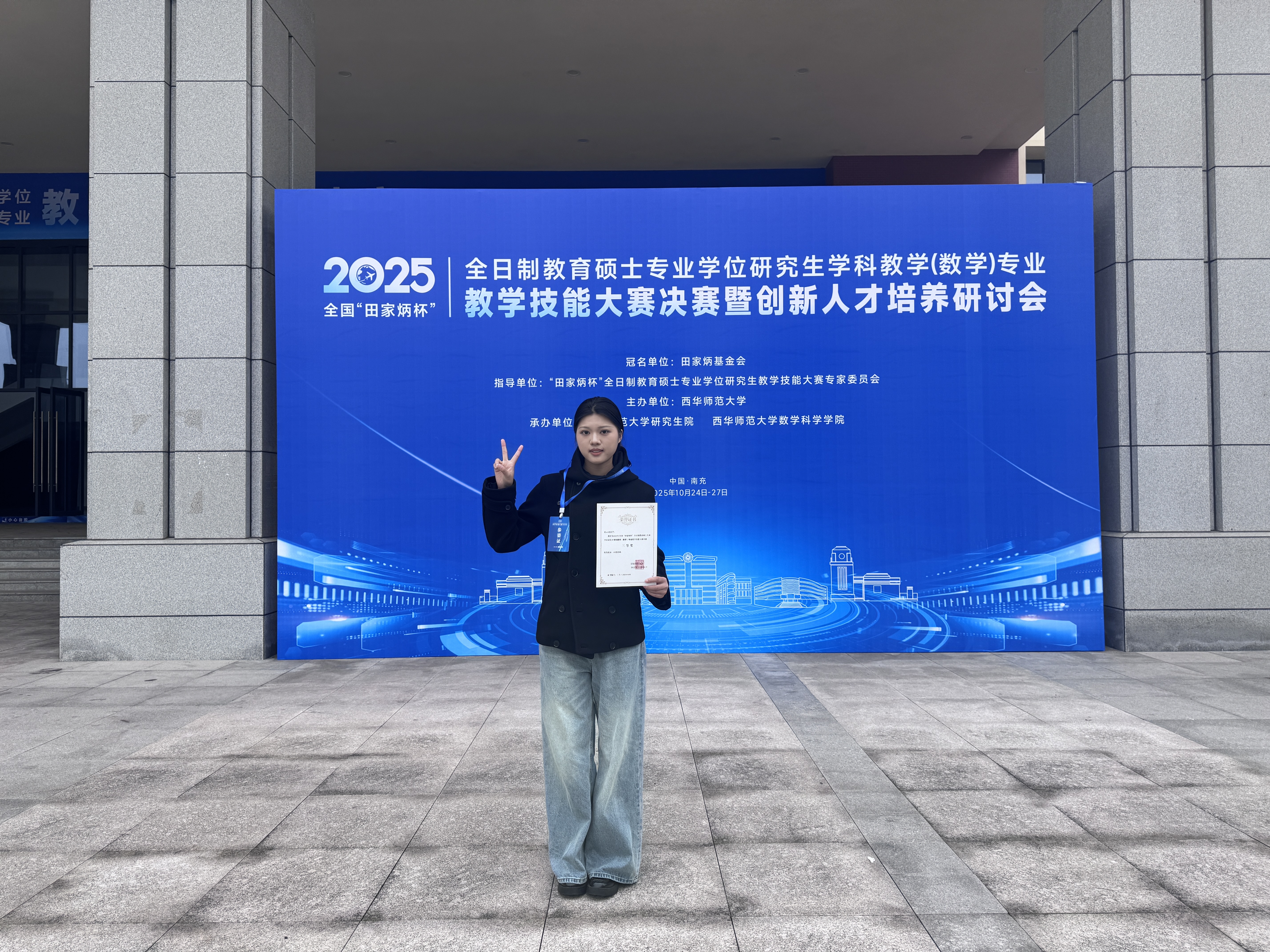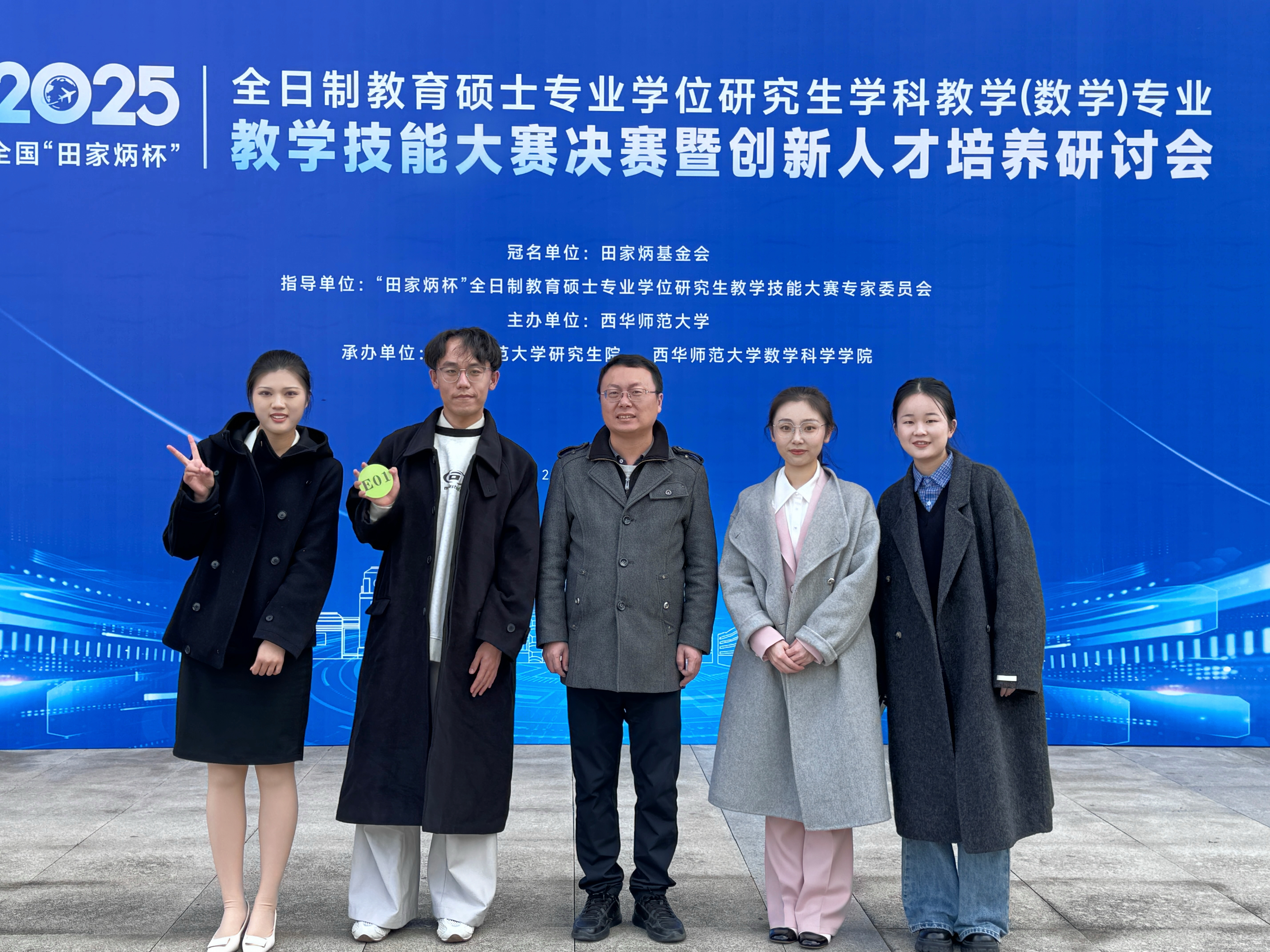 10月24日至27日,由西华师范大学主办的2025年全国“田家炳杯”全日制教育硕士专业学位研究生学科教学(数学)专业教学技能大赛决赛圆满落幕。我院4名参赛研究生在激烈的角逐中斩获佳绩,其中,高洁同学荣获一等奖,唐心诗、王璐瑶同学荣获二等奖,葛小利同学荣获三等奖,刘锦、化小会两位老师荣获“优秀指导老师”称号,充分彰显了我院在教育硕士培养方面的深厚积累和显著成效。