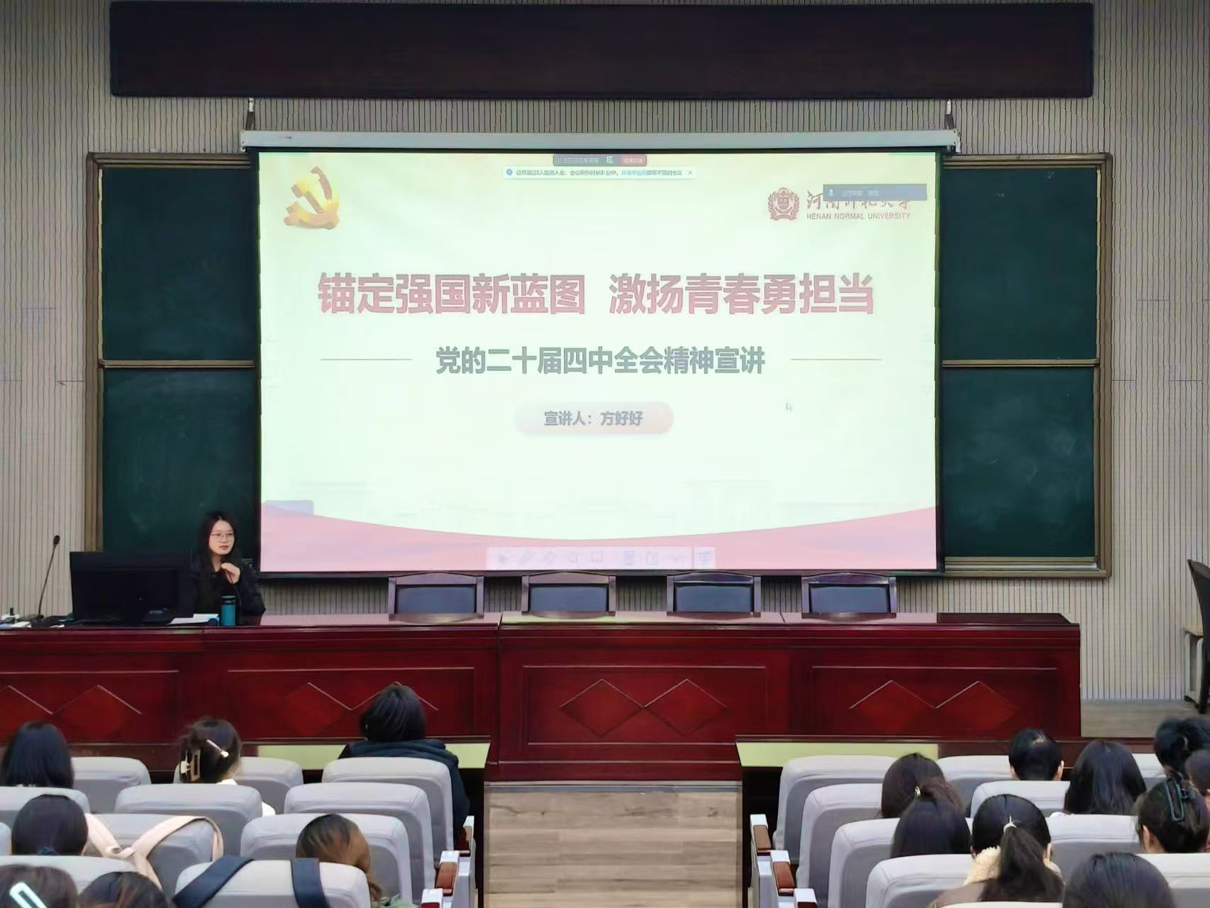 为深入学习贯彻党的二十届四中全会精神,推动党的二十届四中全会精神在青年学子中落地生根,12月4日,“理响师大”宣讲团成员、数学与统计学院(密码学院)2024级本科生辅导员方好好以“锚定强国新蓝图激扬青春勇担当”为题,通过线上线下相结合的方式,在数学院报告厅为研究生学子们带来了一场主题鲜明、内涵丰富的思政宣讲会全体研究生参加了本次会议。