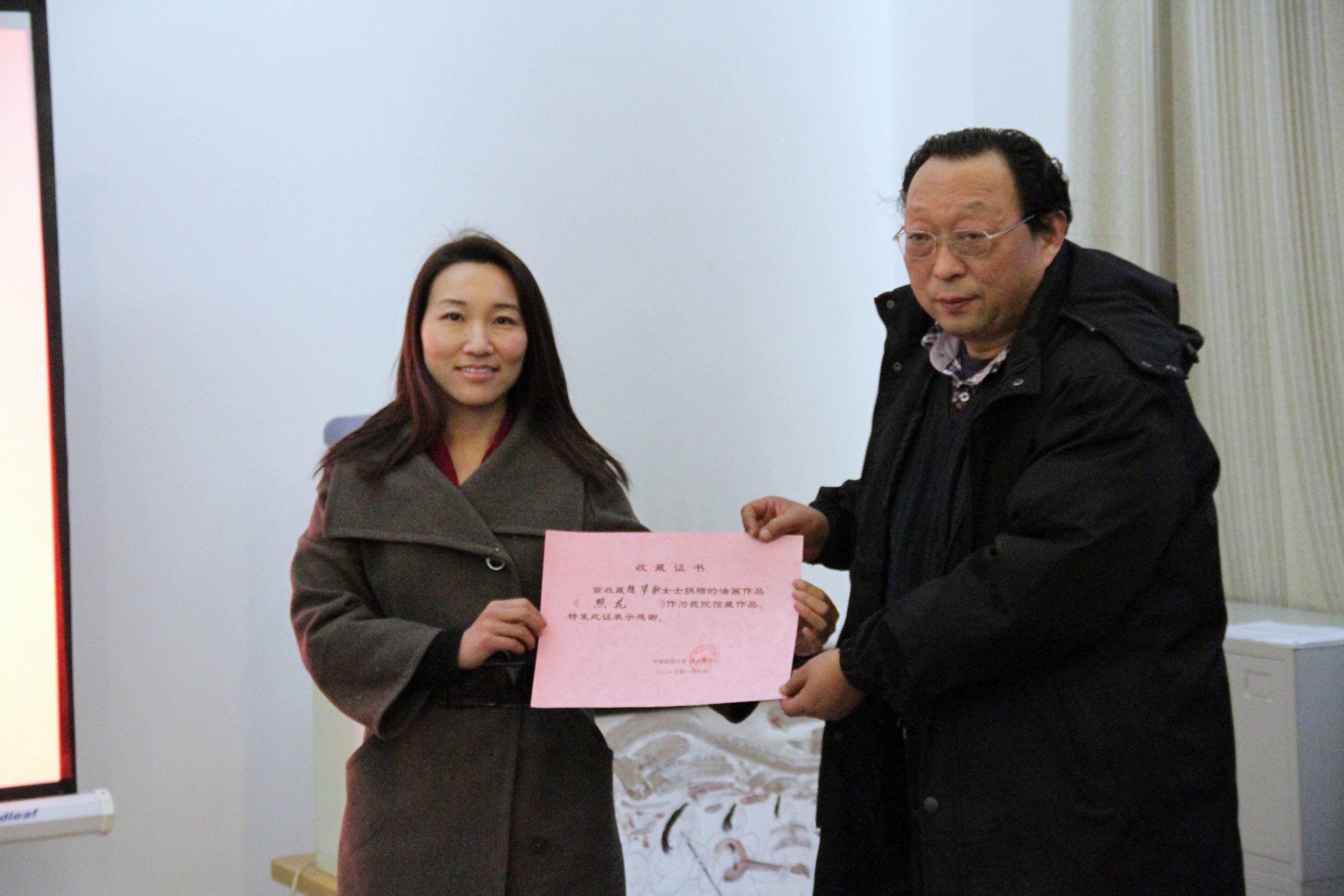 2013年1月7日下午“赵梦歌作品捐赠及教授聘任仪式”在河南师范大学美术学院举行。画家赵梦歌女士向河南师范大学美术学院捐赠了油画作品《照花》(70×70CM)。美术学院院长张建伟颁发赵梦歌女士“河南师范大学美术学院兼职教授”聘任证书及“收藏证书”。